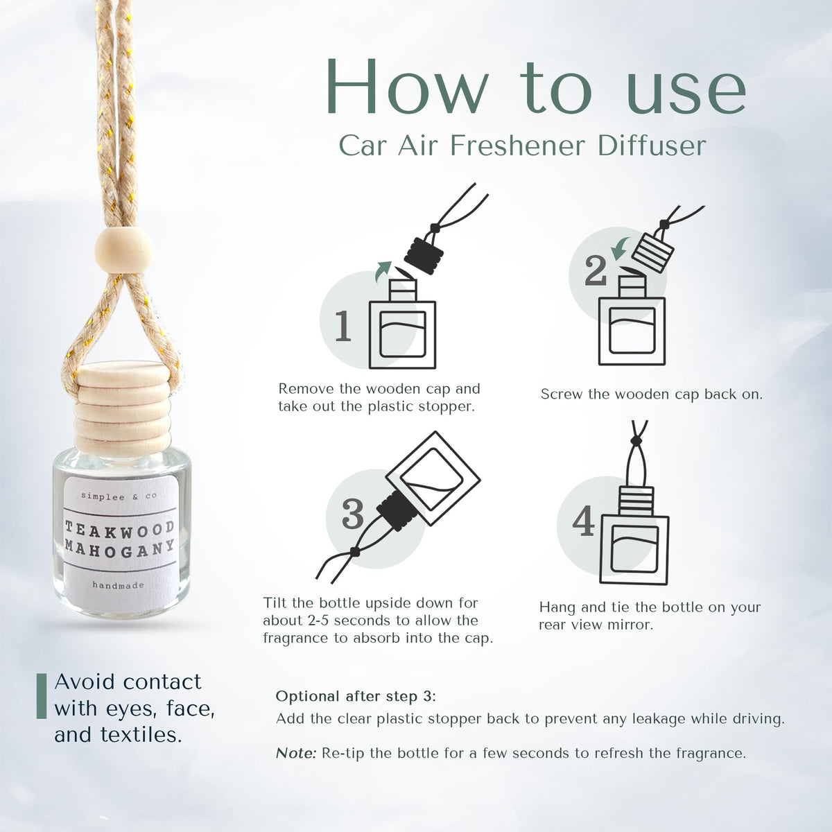 Elevate your driving experience with Simplee & co's elegant car hanging air oil diffusers. Explore our varied collection of fragrances to tailor the scent and ambiance of your vehicle to reflect your unique style. Crafted with high-quality USA Made Fragrance Oil, each diffuser delivers a superior and long-lasting scent. Simply tilt the diffuser towards the wooden cap to refresh the fragrance as needed. With proper care, enjoy up to 90 days of continuous, enchanting aroma, making every journey more enjoyable. Enhance your vehicle's atmosphere with a touch of sophisticated flair. Each order includes 2 oil diffusers. Teakwood Mahogany Top Notes: Delicate teakwood Middle Notes: Warm mahogany Base Notes: Rich, woody undertones Midnight Black Ice (similar to Black Ice) Top Notes: Fresh bergamot Middle Notes: Wild lavender, understated florals Base Notes: Sandalwood, musk Fruity Rings (similar to Fruit Loops) Top Notes: Citrus zest, fruity sweetness Middle Notes: Cereal grain Base Notes: Vanilla, sugar Salted Caramel Top Notes: Coconut, caramelized sugar Middle Notes: Silky caramel vanilla Base Notes: Hint of salt Sandalwood Rose Top Notes: Delicate rose petals, fresh greenery Middle Notes: Rich earthy wood Base Notes: Soft musk Pink Sugar Top Notes: Sweet berries, fig leaves Middle Notes: Licorice, orange Base Notes: Cotton candy, caramel, powdery accents Baja Cactus Blossom Top Notes: Fresh florals, subtle coconut Middle Notes: Light floral blend Base Notes: Musk, sandalwood Balsam Fir Top: Green Middle: Pine Bottom: Wood, Musk Apple Cinnamon Top: Green, Apple Middle:Peach, Cinnamon, Clove Bottom:Tonka Pumpkin Spice Latte Top: Butter Middle: Cinnamon, Clove Bottom: Coconut, Tonka, Black Coffee Eucalyptus & Spearmint Top: Mint Middle: Eucalyptus Bottom: Musk Eucalyptus Forest Top: Fresh Eucalyptus Middle: Peppermint Leaf Bottom: White Cedar Be Enchanted Top: Green Apple, Peach, Juicy Middle: Dew Rose, Water Lily Bottom: Cedar, Sandalwood, Vetiver, Musk Ocean Shore Linen Top: Fresh, Melon, Dewy Greens Middle: Fir Needles, Eucalyptus, Cyclamen, Aquatic Bottom: Sea Moss, Sandalwood, Cedarwood, Musk