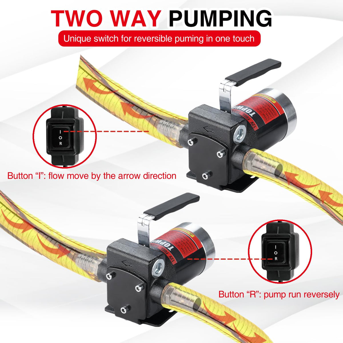 Q: How does the reversible pumping feature work?A: The TOPWAY fuel pump features a double way switch that allows you to toggle between forward and reverse pumping modes, enabling you to easily change the direction of fluid transfer based on your needs.