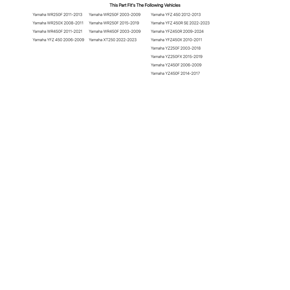 Q: What vehicles is the Tusk 4-Stroke Oil Change Kit compatible with?A: The Tusk 4-Stroke Oil Change Kit is specifically designed for Yamaha YZ250F models from 2003 to 2018. Always refer to the fitment guide image for additional compatibility with other machines.