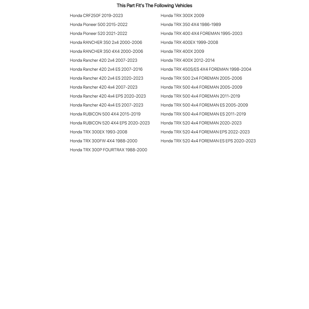 Q: What vehicles are compatible with the Tusk First Line Oil Filter?A: The Tusk First Line Oil Filter is compatible with Honda CRF250F models from 2019 to 2025 and TRX 400EX models from 1999 to 2008. Please refer to the fitment guide image for additional compatibility information.