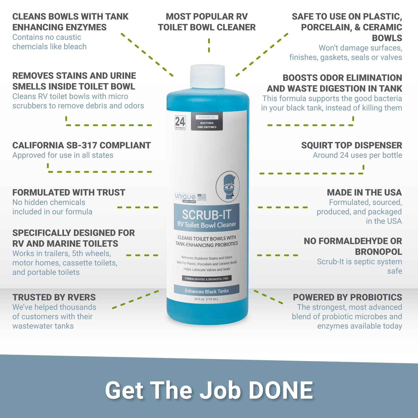 Enjoy Your Rv. Leave Your Rv Toilet Bowls To Us. Enhance Your Holding Tank While Cleaning Your Rv Toilet Bowl. Make Your Rv Toilet Bowls Sparkle With Unique Scrub-It, Powered By Black-Tank-Enhancing Probiotics And Enzymes! Cleaning Your Rv Toilet Bowl With Traditional Toilet Bowl Cleaners, Which Contain Caustic Chemical Ingredients, Will Hinder Your Black Tank'S Ability To Break Down Waste And Keep Odors Under Control. With Unique Scrub-It Rv Toilet Bowl Cleaner, You Can Remove Stubborn Stains, Debris, And Odors From Your Rv And Boat Toilet Bowl While Boosting Your Black Tank With Beneficial Enzymes, And It Enhances Septic Activity In Home And Campground Systems Too. With Scrub-It, You Can Expect Sparkling Bowls And A Formula That Won'T Harm The Beneficial Probiotics Inside Your Black Tank. One Of The Essentials For Every Rv Bathroom. 24 Uses Per Bottle, Contains No Hidden Chemicals, Best-Selling Rv Toilet Bowl Cleaner. Thoughtfully Formulated And Manufactured In The Usa For Your Family And Pets Without Hidden Chemicals. Disclaimer: Ingredient Disclosures Are To The Best Of Our Knowledge Based Upon Information Provided By Our Raw Material Suppliers.