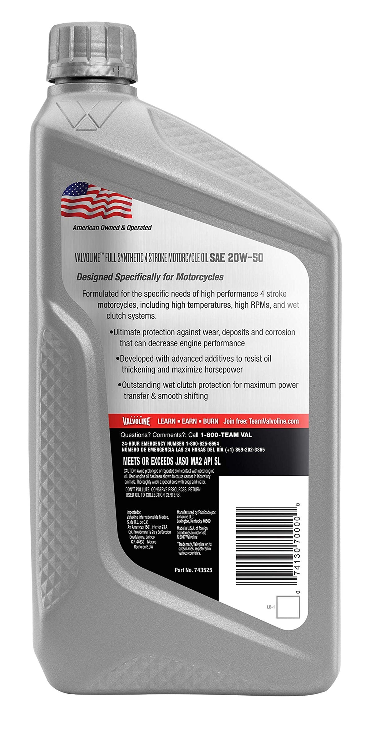 Valvoline 4-Stroke Motorcycle Sae 20W-50 Full Synthetic Motor Oil Provides The Ultimate Wet Clutch, Transmission And Engine Protection For High Performance 4-Stroke Motorcycles, Cruisers And Off-Road Bikes. Our Anti-Friction Formulation Is Specifically Designed For The Extreme Temperatures And High Rpms Of 4-Stroke Motorcycles, Meeting Or Exceeding All Specifications Set By The Japanese Automotive Standards Organization (Jaso) And The American Petroleum Institute (Api). It Provides Outstanding Wet Clutch Protection And Helps Prevent Slippage To Ensure Smooth Shifting And Optimal Power Transfer. While Advanced Additives Safeguard Against Deposits, Corrosion And Oil Thickening That Can Decrease Performance And Longevity. No Wonder Motorcycle Owners And Race Teams Around The World Rely On Valvoline, The Trusted Motor Oil Brand For Over 150 Years.
