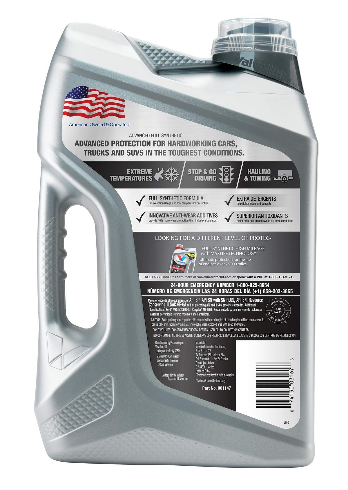 Todayas Advanced Engine Technology Requires Advanced Protection Valvoline Advanced Full Synthetic, The Motor Oil Specially Designed To Protect Todayas Sophisticated Engines Our Exclusive Mixture Contains Advanced Anti-Wear Additives, Superior Antioxidants And Extra Detergents It Protects 40% Better Against Wear, Resists Oil Breakdown 10-Times Better, And Defends 25% More Against Deposits Than Industry Standards For Maximum Performance And Engine Longevity And With An Exceptional Range Of Temperature Protection, It Ensures Your Engine Will Be Prepared For Any Rough Weather And Road Conditions Engineered With Ingenuity, Tested With Tenacity, And Proven With Purpose, Our Formula Was Innovated In America With A Century And A Half Of Hands-On Experience From The Original Motor Oil Brand
