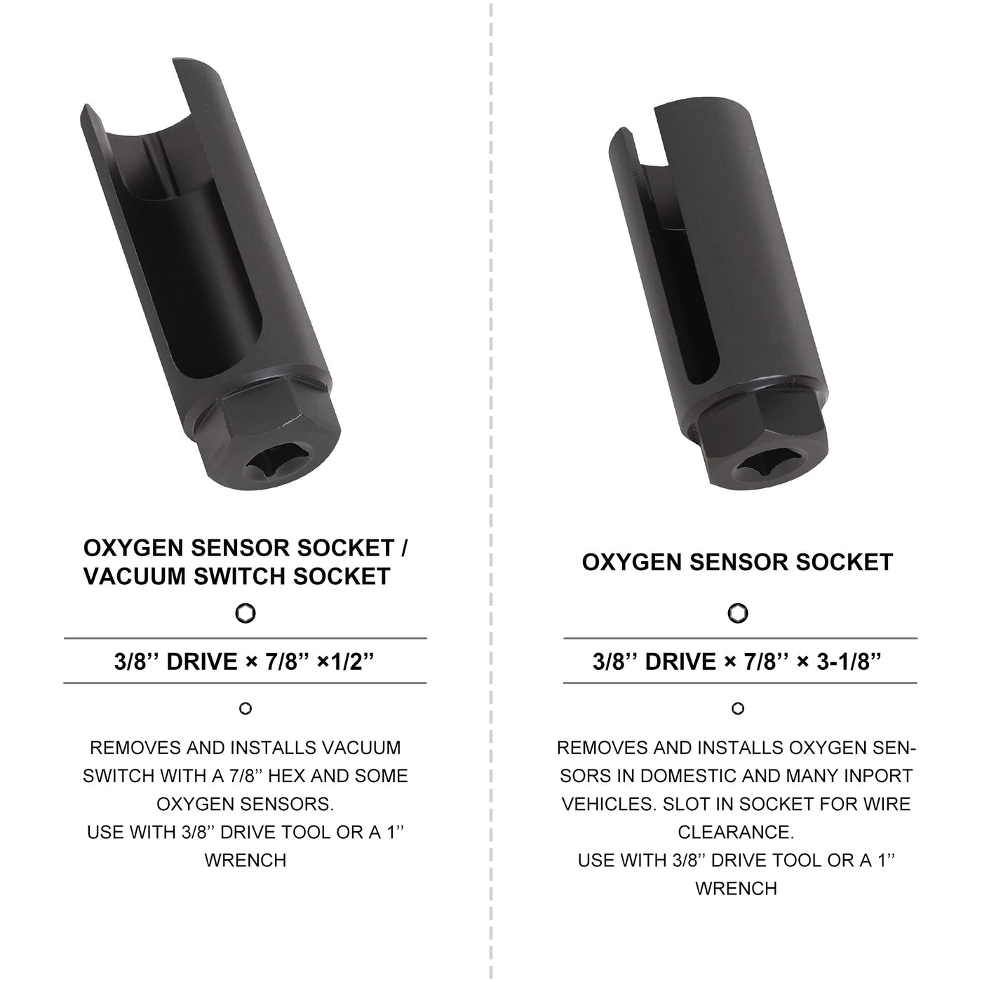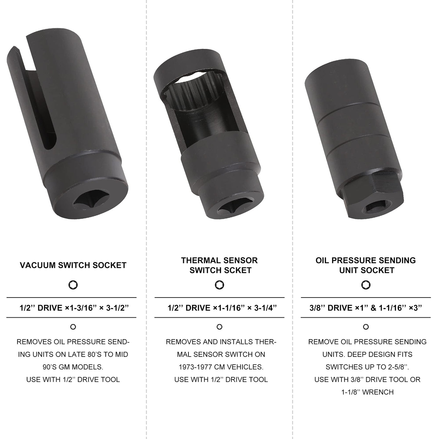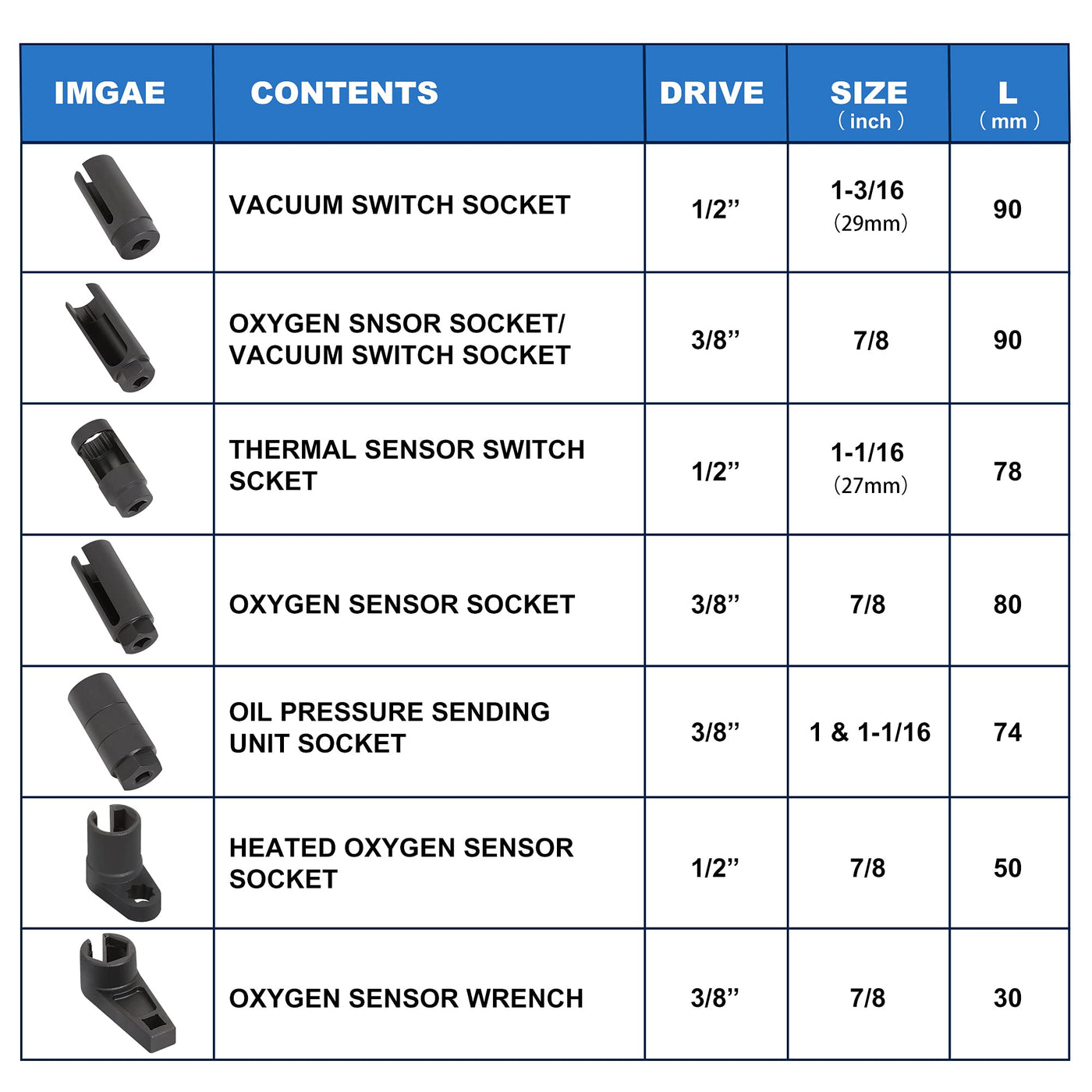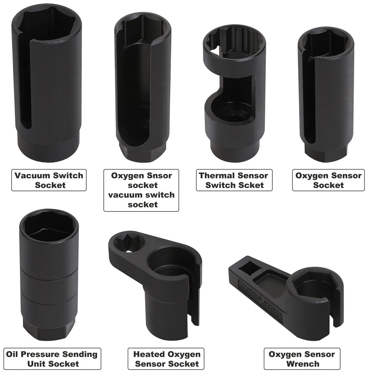 This Set Includes 1-116 And 1 In Oil Pressure Sending Unit Socket, 38 In Drive, 1-316 In Oil Pressure Sending Unit Socket, 12 In Drive, 1-116 In Thermal Sensor Switch Socket, 12 In Drive 78 In Heated Oxygen Sensor Socket, 12 In Drive, 78 In Low Profile Offset Oxygen Sensor Socket, 38 In Drive, 78 In Oxygen Sensor Socket, 38 In Drive, 78 In Universal Vacuum Pvs, Tvs Valve And Oxygen Sensor Socket, 38 In Drive
