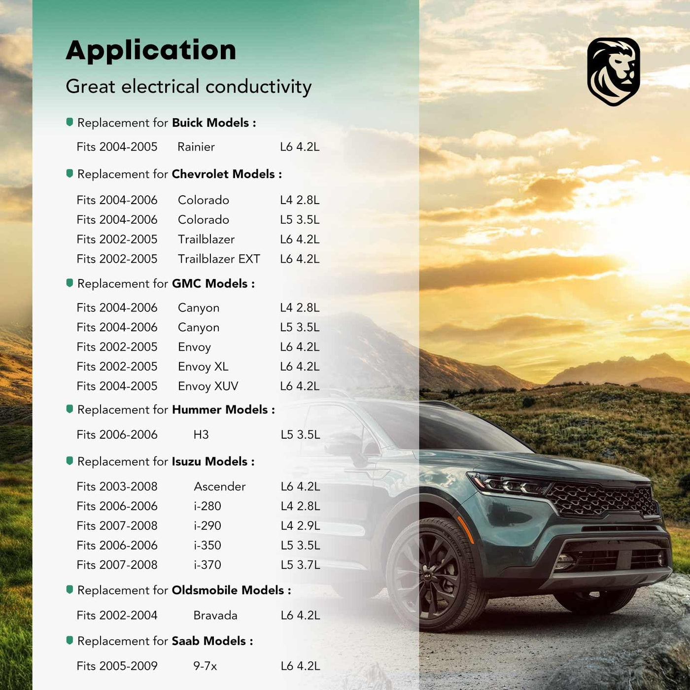 Fitment: Fits for Buick Rainier 2004-2005 l6 4.2L Petrol Naturally Aspirated Fits for Chevrolet Colorado 2004-2006 l5 3.5L Petrol Naturally Aspirated Fits for Chevrolet Trailblazer 2002-2005 l6 4.2L Petrol Naturally Aspirated Fits for Chevrolet Trailblazer EXT 2002-2005 l6 4.2L Petrol Naturally Aspirated Fits for GMC Canyon 2004-2006 l5 3.5L Petrol Naturally Aspirated Fits for GMC Envoy 2002-2005 l6 4.2L Petrol Naturally Aspirated Fits for GMC Envoy XL 2002-2005 l6 4.2L Petrol Naturally Aspirated Fits for GMC Envoy XUV 2004-2005 l6 4.2L Petrol Naturally Aspirated Fits for Hummer H3 2006 l5 3.5L Petrol Naturally Aspirated Fits for Isuzu Ascender 2003-2005 l6 4.2L Petrol Naturally Aspirated Fits for Isuzu Ascender 2008 l6 4.2L Petrol Naturally Aspirated Fits for Isuzu i-350 2006 l5 3.5L Petrol Naturally Aspirated Fits for Isuzu i-370 2007-2008 l5 3.7L Petrol Naturally Aspirated Fits for Oldsmobile Bravada 2002-2004 l6 4.2L Petrol Naturally Aspirated Fits for Saab 9-7x 2005 l6 4.2L Petrol Naturally Aspirated
