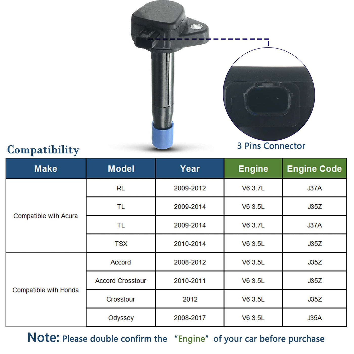 Q: What vehicles are compatible with the YHTAUTO ignition coil pack?A: The YHTAUTO ignition coil pack is compatible with several Honda and Acura models, including the Honda Accord (2008-2012), Accord Crosstour (2010-2011), Odyssey (2008-2017), and Acura RL (2009-2012), TL (2009-2014), and TSX (2010-2014). It fits V6 engines of 3.5L and 3.7L.