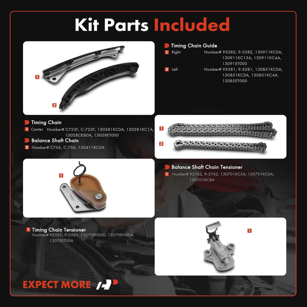 Q: What parts are included in the A-Premium Timing Chain Kit?A: The A-Premium Timing Chain Kit includes a Timing Chain (Center), Balance Shaft Chain, Balance Shaft Chain Tensioner, Timing Chain Tensioner, and two Timing Chain Guides (Right and Left), totaling six pieces.