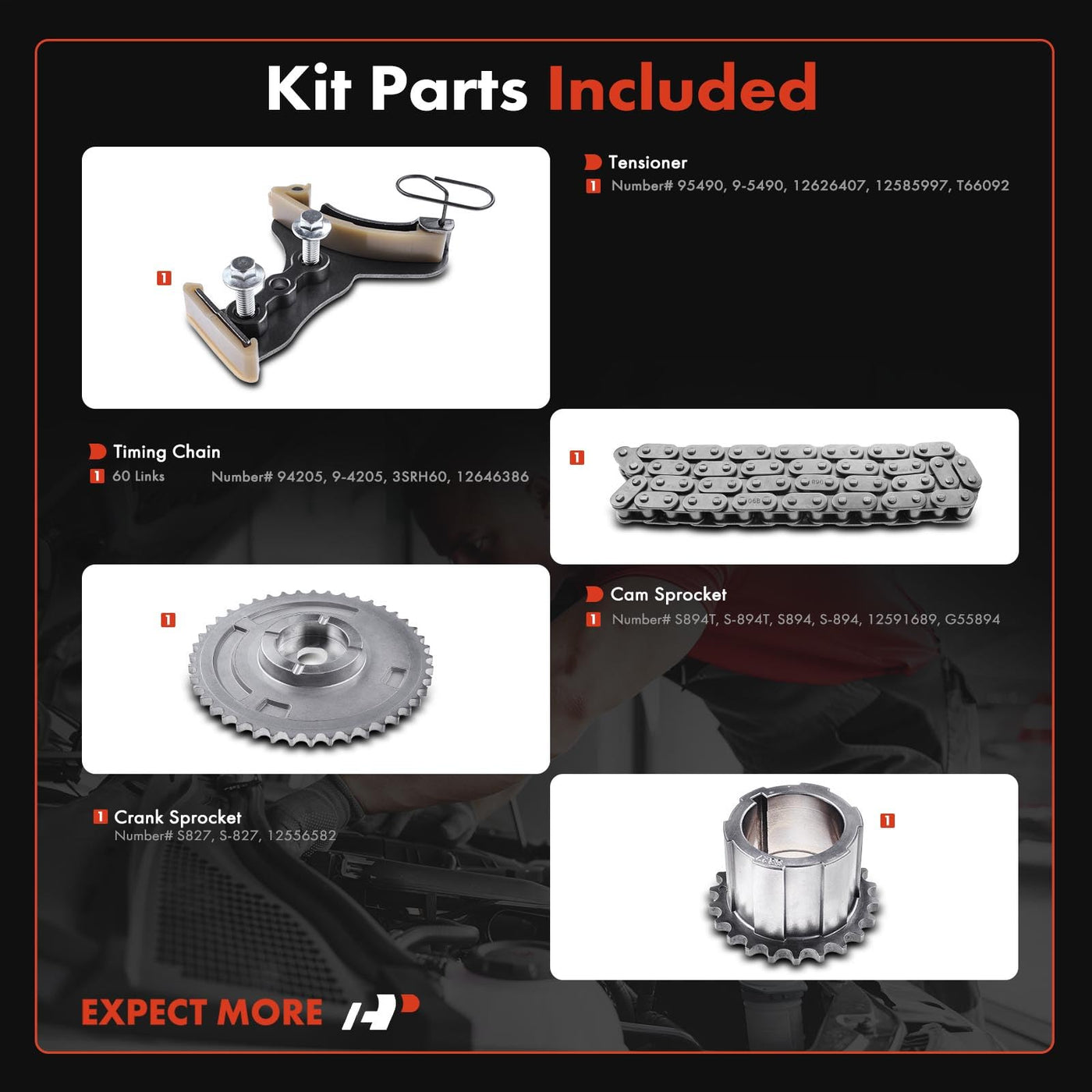 Q: What is included in the A-Premium Timing Chain Kit?A: The A-Premium Timing Chain Kit includes essential components such as a timing chain (60 links), tensioner, cam sprocket, and crank sprocket. This comprehensive set ensures you have everything needed for a complete timing chain replacement.