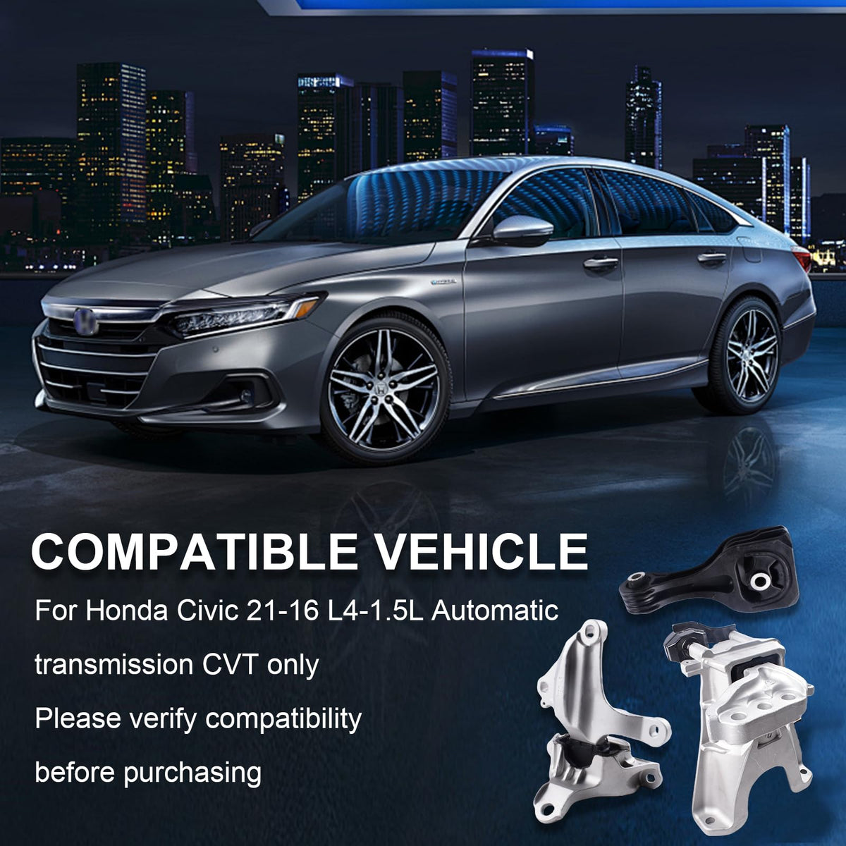 Q: Is the DOFOCH Engine Motor & Trans Mount compatible with my 2016 Honda Civic?A: Yes, the DOFOCH Engine Motor & Trans Mount is specifically designed for the 2016-2021 Honda Civic with a 1.5L CVT transmission. Please verify your vehicle's compatibility before purchasing.