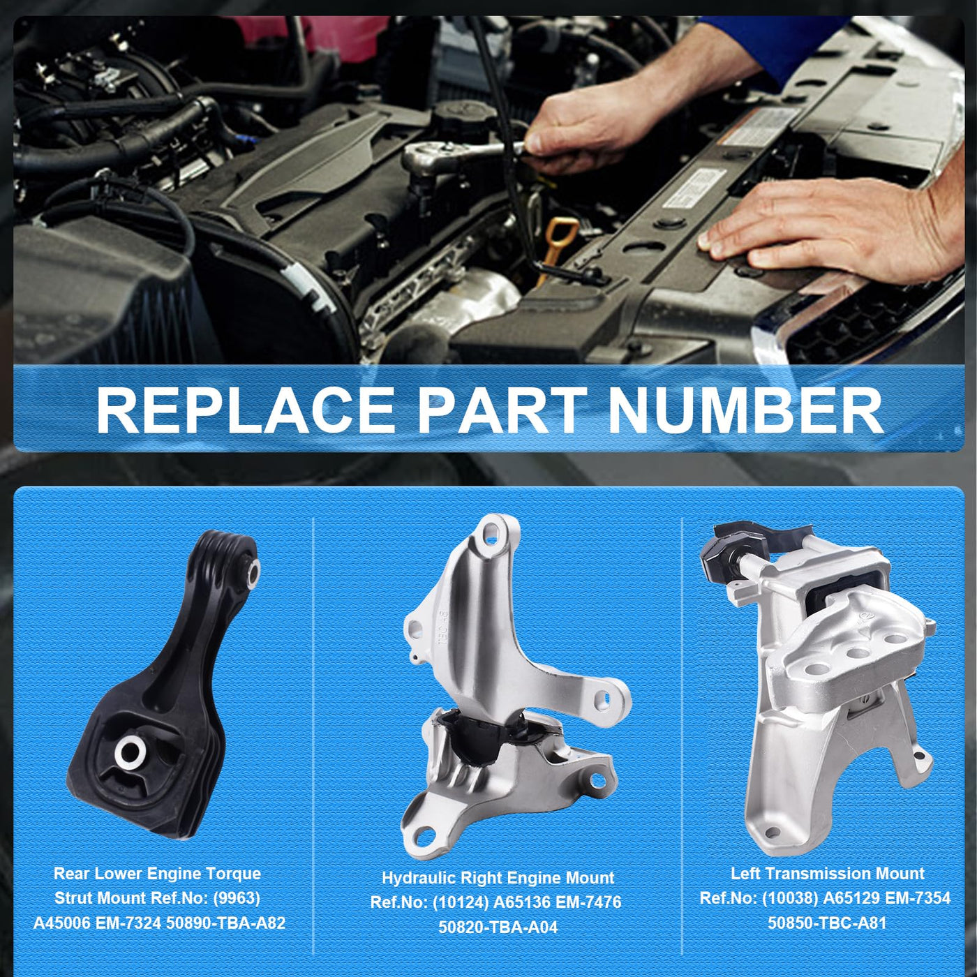 Q: What part numbers does this engine mount replace?A: This engine mount replaces several part numbers, including 50820-TBA-A04, 50890-TBA-A82, and 50850-TBC-A81. Ensure that your current mount matches these part numbers for proper fit.