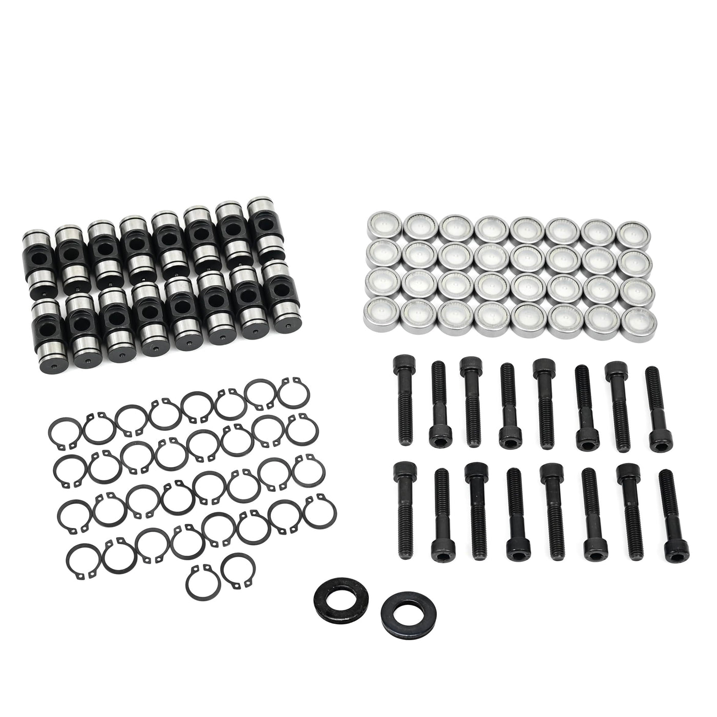 These LS Series retrofit trunion kits are designed to convert stock LS Series rocker arms into captured roller bearing rocker arms. The factory bearings are a known failure on the LS Engines. When they fail they send small bearings through the entire engine. The upgraded trunions use a captured roller bearing allowing for a reliable smooth rotation. The upgraded trunions also give more stability at higher RPM. We use these trunion kits in anything from stock 4.8's all they way up to 1,000+hp turbo motors. The Kit includes the rocker arm trunions, rocker arm bearings, and rocker arm retaining rings and upgraded bolts for a complete installation. The bolts we supply are slightly shorter than factory bolts so they do not protrude into the intake ports. Bolts are stronger than a grade 8 bolt with a minimum tensile strength of 170,000 psi. Installation is fairly simple with the use of a press or a simple vise along with basic hand tools. Instructions are included to aid in the installation.