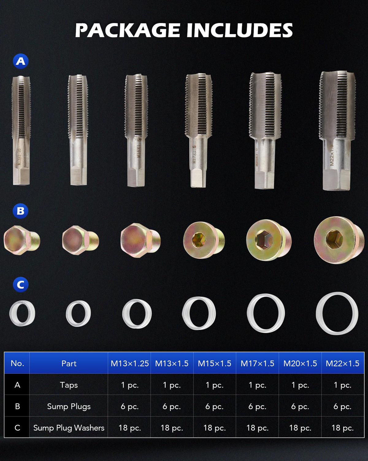 Say goodbye to the hassle and high expense of oil pan repairs with Orion Motor Tech's thread repair kit! This oil pan drain plug repair kit consists of a total of 150 pieces, including taps, crush washers, and drain plugs in the 5 most needful metric sizes (M13, M15, M17, M20, and M22) for a quick and easy fix, making it compatible with a wide range of passenger cars and light trucks. With this rethreading kit, you'll be able to repair damaged or stripped threads in no time, without having to replace your entire oil pan. These inner thread restorers offer superior strength, endurance, and corrosion resistance thanks to their carbon steel and aluminum builds, ensuring dependable use for years to come. Don't let a damaged oil pan ruin your day. Restore your threads and your peace of mind with our all in one kit! Specifications Material: Carbon Steel, Aluminum Metric Sizes: M13x1.25, M13x1.5, M15x1.5, M17x1.5, M20x1.5, M22x1.5 Case Dimensions: 10.7 x 9.2 x 2.8 in. (27.2x23.3x7 cm) Net Weight: 5.2 lb (2.4 kg) Warranty: 1 Year Package List 6x Taps 36x Drain Plugs 108x Washers 1x Storage Case 1x Instructions