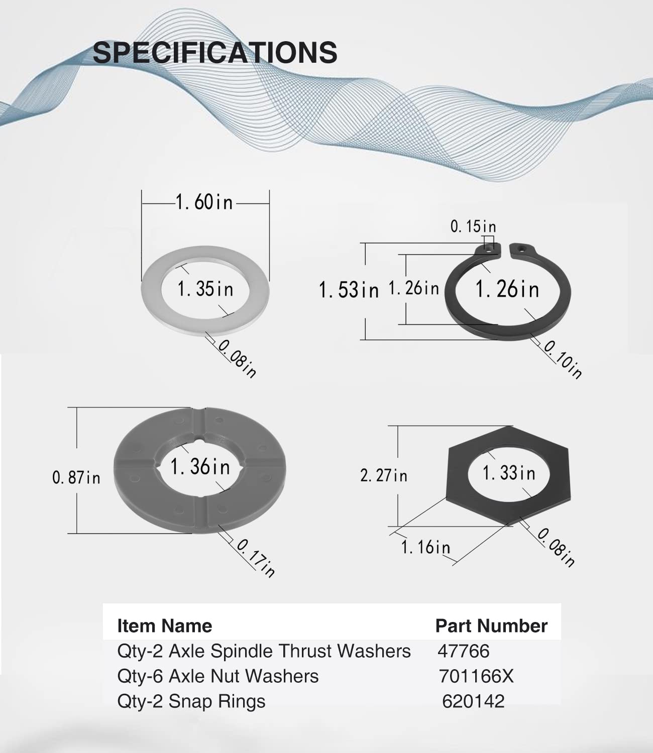 Q: What does the Thrust Washer Snap Ring Kit include?A: The kit includes 2 Axle Spindle Thrust Washers (MPN: 47766), 6 Axle Nut Washers (MPN: 701166X), and 2 Snap Rings (MPN: 620142), providing all necessary components for your maintenance needs.