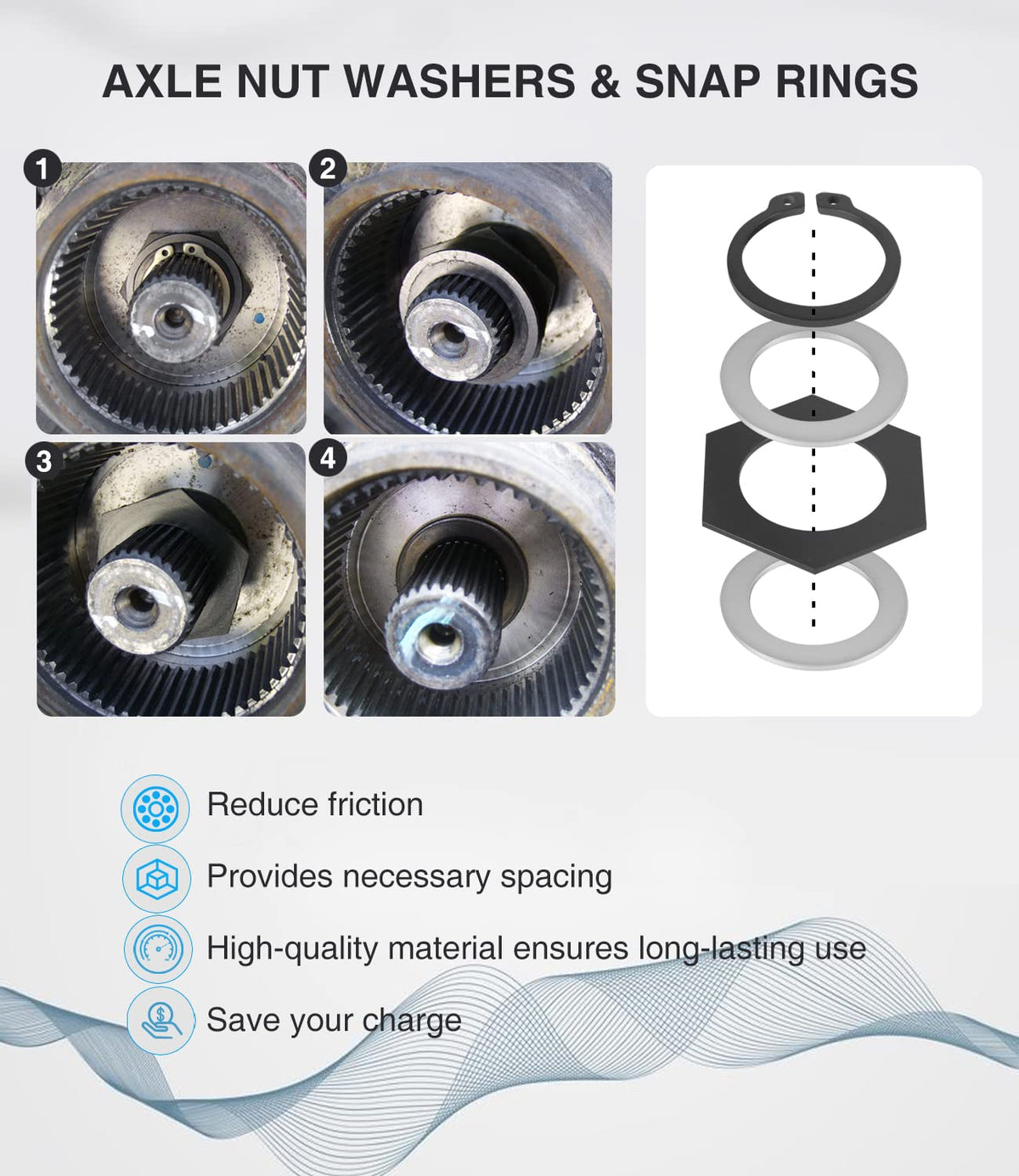 Q: How does the thrust washer snap ring kit benefit my vehicle's performance?A: This kit offers necessary spacing and reduces friction, which enhances the overall performance of your vehicle. It is designed to maintain optimal functioning, ensuring a smooth driving experience.