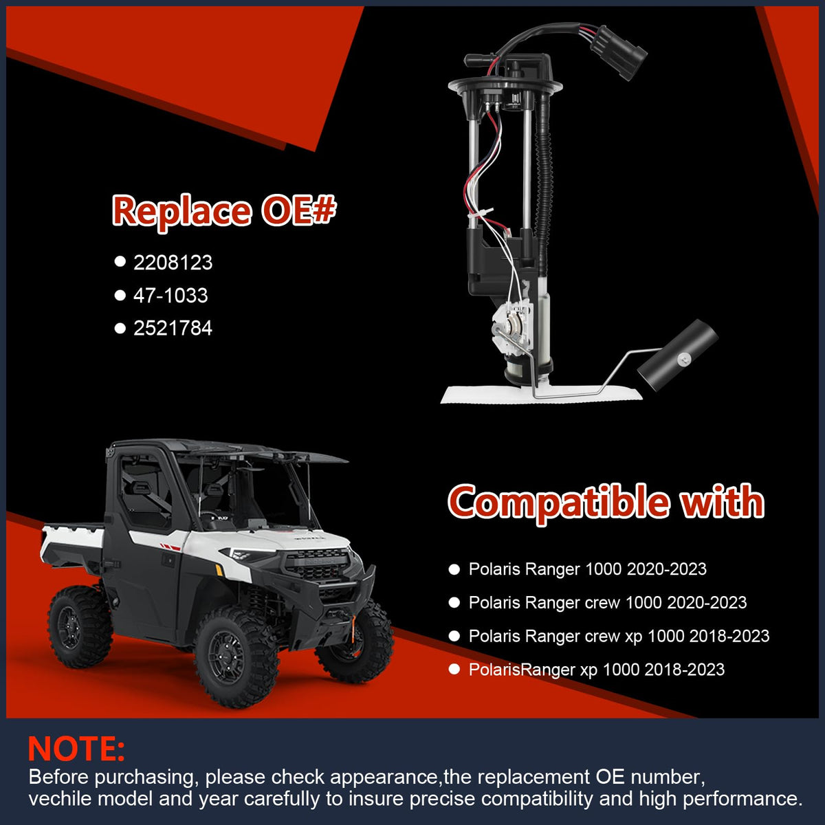 2208123 47-1033 Electric Fuel Pump Module Assembly Compatible With Polaris Ranger XP 1000 EPS 2018-2023, Fits for Polaris Ranger Crew XP 1000 2018-2023 Replace OE# 2208123 47-1033 2521784VEHICLE FITMENT: this 2208123 electric fuel pump assembly is a compatible replacement fits for Polaris Ranger 1000 2020 2021 2022 2023 model years, Ranger Crew 1000 2020-2023, Ranger Crew XP 1000 2018-2023, Ranger XP 1000 2018-2023, fits for Polaris PRO XD Full Size Gas 2022-2024, PRO XD Full Size Gas Crew 2022-2024REPLACE OE PART NUMBER: this Fuel Pump Assembly can serve as a direct replacement for 2208123 47-1033 2521784 these OEM part numbers. When buying a replacement, ensure to check the compatibility of the part with the vehicle model and year to guarantee proper fit and high performance. And check the photos carefully to make sure the photos showed is the same as you wanted.If not, please do not purchase it even your model is in the described list.OEM QUALITY: The electric fuel pump module assembly is designed to meet or exceed OEM specifications, ensures efficient and consistent fuel delivery for optimal engine performance,even under demanding driving conditions.It's made of strong and durable material, durable and not easy to deform,no worry about breaking or cracking easily during installation and use,effectively extending the service life.The performance of our pump installation is the same as the original pump, save much of your timeEASY PLUG-IN INSTALLATION: this fue pump is easy to install as original one, direct replace all worn parts including fuel pump, tank seal, components, etc. in one go with our comprehensive installation kit