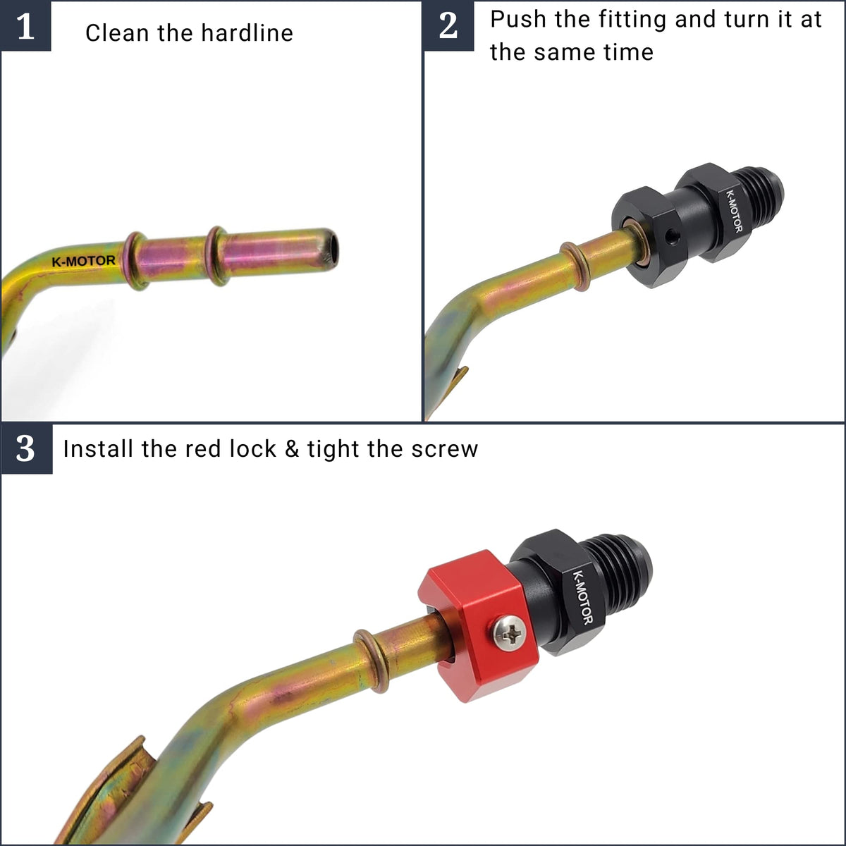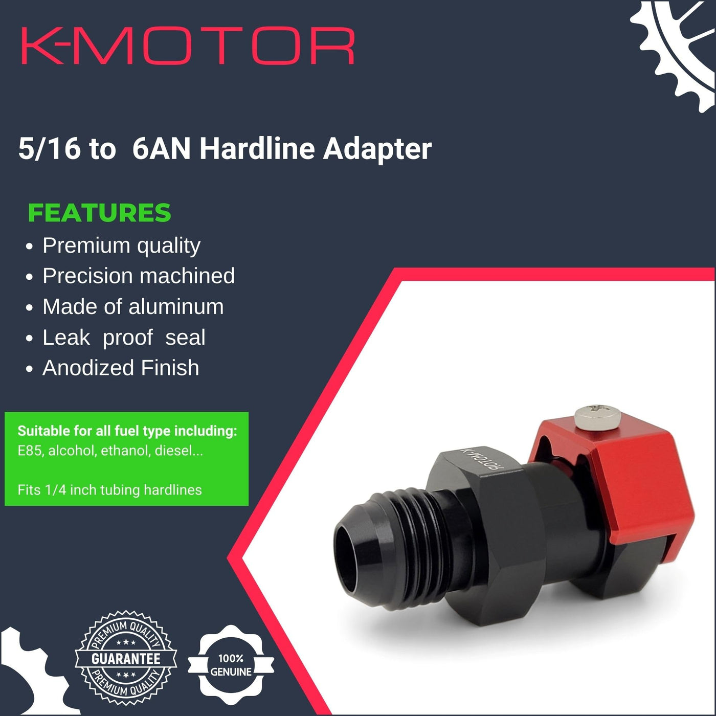 K-Motor Performance &Nbsp; Universal Efi&Nbsp; Fuel Fitting 6An Male To 5/16 Hardline Female&Nbsp; Sae Quick Disconnect Adapter. High Presicion Cnc Machined Black Color High Quality Seals Leak Proof Sealing&Nbsp; &Nbsp; &Nbsp; This Adapter Is Made To Convert Your Stock&Nbsp;Oem Efi 5/16''&Nbsp;Hardline Or Fuel Rail&Nbsp; To -6 An Male This Will Allow You To Run Tucked / Braided / Custom Hoses For Your Engine For Clean Look If You Want To Measure And Confirm What Size Efi Fitting You Have, Simply Check The Line Thickness With A 1/4'', 5/8 Or 5/16'' Wrench. &Nbsp; &Nbsp; Note: Lubricated The Inner O'Rings And Hardline With Oil Or Grease Before Push The Adapter To Prevent O'Rings Damaged &Nbsp; &Nbsp; Works For: Honda / Acura 5/16 Hardlines &Amp; Oem Fuel Rail. 5/16 Efi Fitting 1996-00 Civic Sending Unit&Nbsp; K Series Fuel Rail (2001-15 Civic / 2002-06 Rsx / 2004-12 Tsx) &Nbsp; &Nbsp; &Nbsp;Lt1, Lt4 &Amp; Ls1 Gm Motors Also Works With Other&Nbsp;Vehicle Brands Chrysler, Mopar&Nbsp; Etc.&Nbsp;