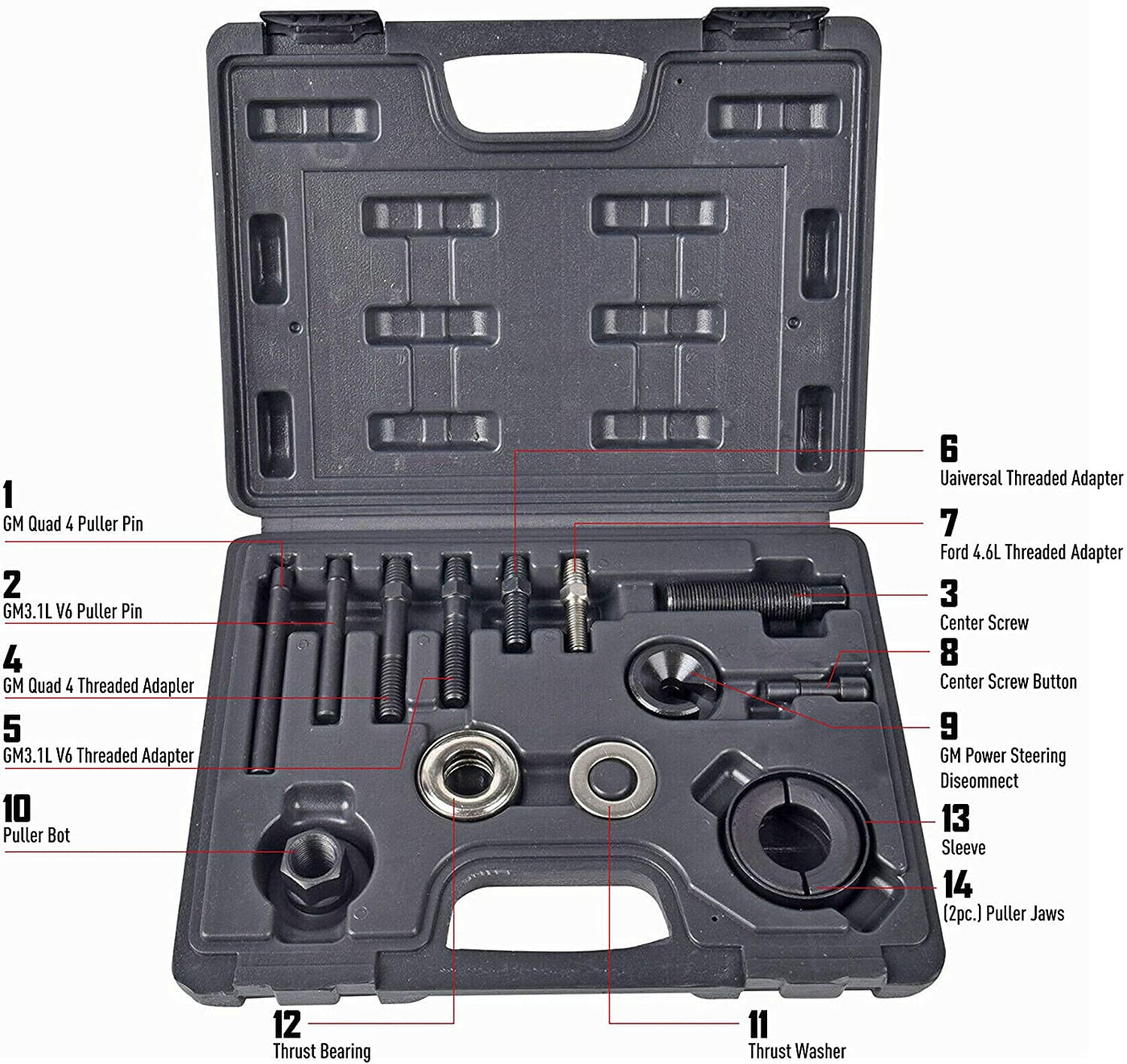 Aain 14 Piece Pulley Remover & Installer Kit Replacing A Faulty Power Steering Pump Is Easier When You Have The Right Tools. This Innovative Kit Has A Variety Of Pins And Adapters So You Can Find The One That Is A Perfect Fit. Set Can Be Used To Remove And Install Both Power Steering And Alternator Pulleys. Strong And Dependable Enough To Last A Lifetime. Kit Services: Most Domestic And Import Vehicles Set Includes: Jaws (2) Thrust Bearing And Thrust Washer Puller Body Gm Power Steering Disconnect Center Screw Button Ford 4.6L And Universal Threaded Adapter Gm 3.1L V6 And Quad 4 Threaded Adapter Center Screw Gm 3.1L V6 And Quad 4 Puller Pin Storage Case
