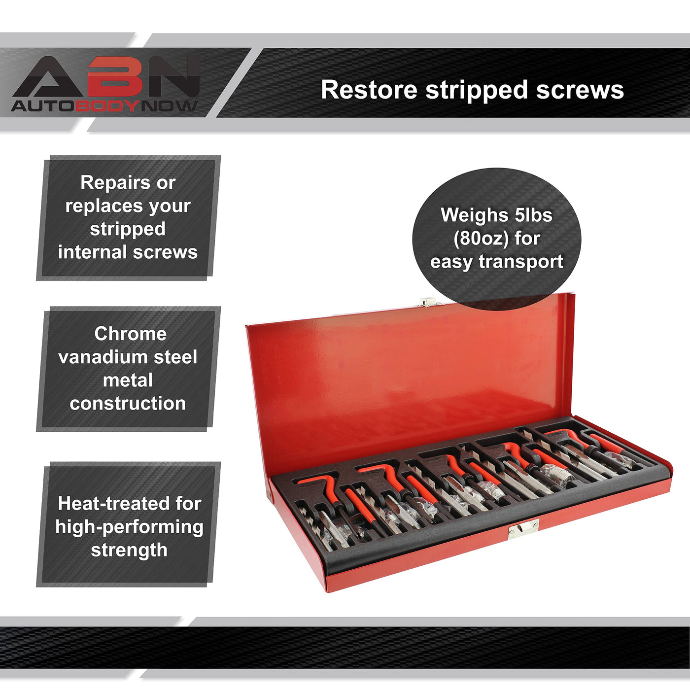 Q: Is the ABN Thread Repair Kit easy to transport?A: Yes, the kit comes in a lightweight steel carrying case weighing only 5lb (2.3kg). This makes it easy to transport between job sites and convenient for storage.