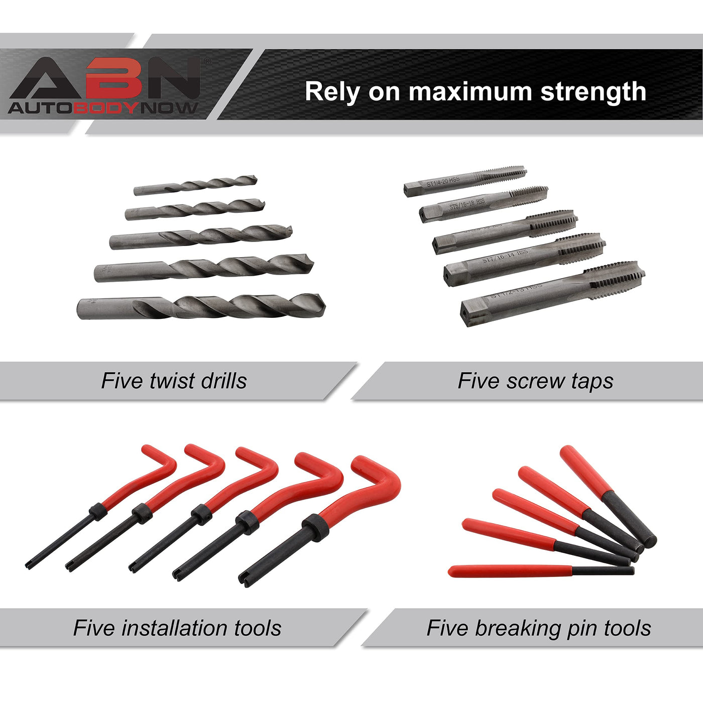 Q: What materials are the tools in the ABN Thread Repair Kit made of?A: The tools in the ABN Thread Repair Kit are constructed from chrome vanadium steel, which ensures maximum strength and corrosion resistance, suitable for repeated use.