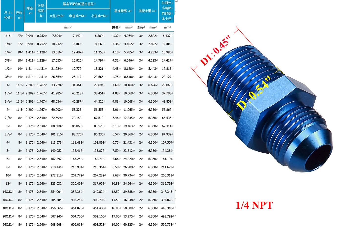 Male AN To NPT Pipe Adapter: Also comes in different sizes, pls contact us for more product information. AN adapter side seals on the flare (cone) not the threads and the NPT side seals on the threads Precision machined to exacting tolerances for trouble-free performance. Made in China. Should not be overtorqued to prevent damage to part. 37-degree sealing angle design assures leak free performance.