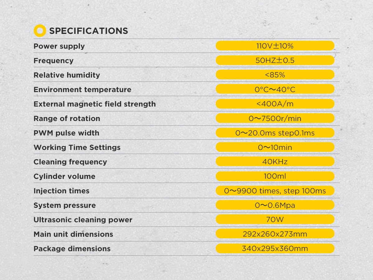 The Function Of The Motorcycle Fuel Injector Cleaner Is To Detect The Atomization, Dripping, Clogging, Fuel Injection Angle Status Of The Injector, And The Size And Balance Of The Fuel Injection Of Each Fuel Injector At Different Speeds. Within The Allowable Adjustment Range, The Test Time, Operating Frequency, Fuel Injection Times, And Shortest Switching Cycle Of The Injector Can Be Adjusted Arbitrarily