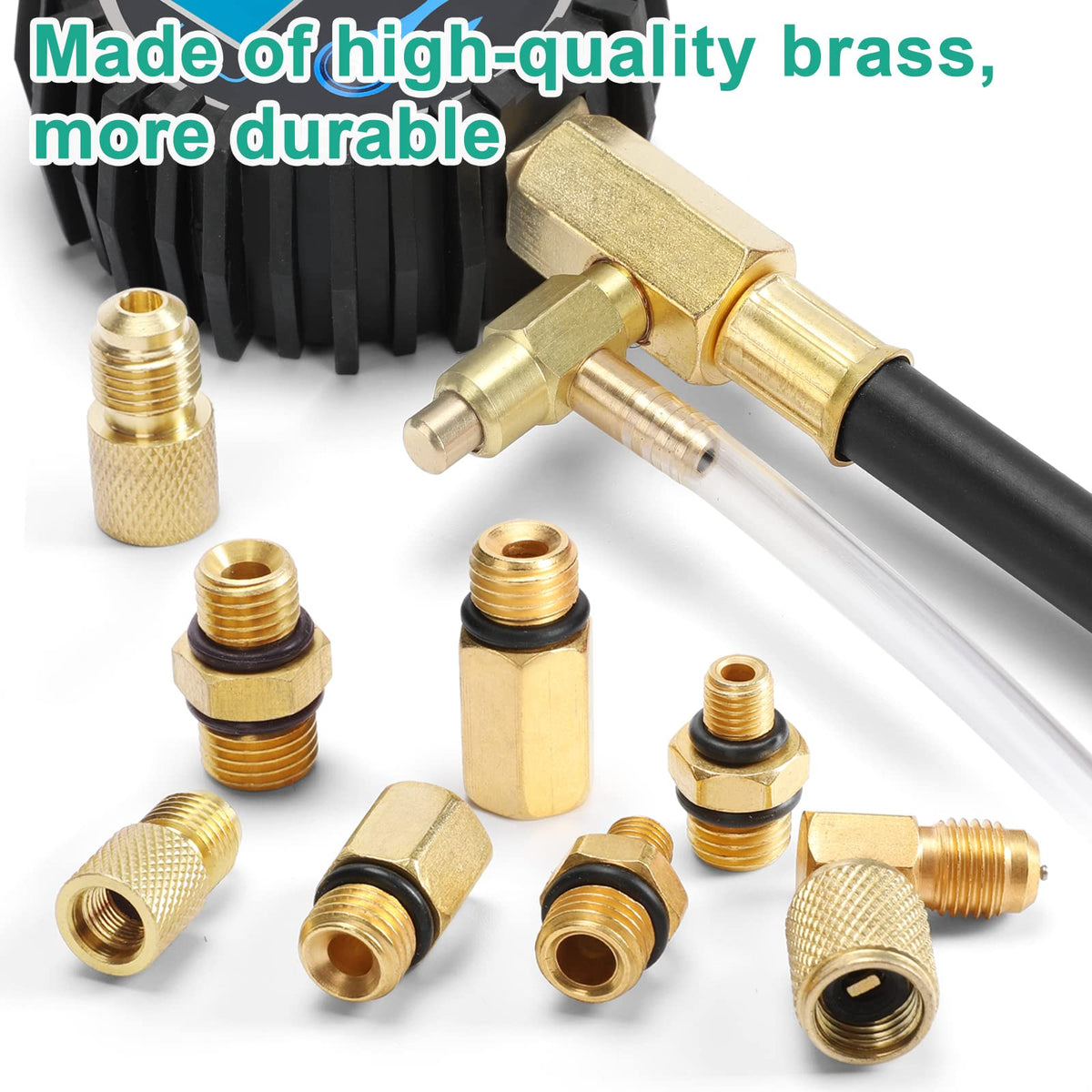 Q: What materials are used in the construction of the BETOOLL Fuel Pressure Gauge?A: The adapters of the BETOOLL Fuel Pressure Gauge are made from high-quality brass to resist rust and corrosion, while the hoses are made of reinforced rubber, designed to withstand pressure, temperature, and torsion.