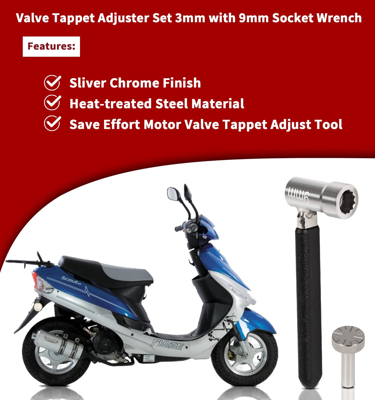 ?Motorcycle Valve Tool?These Valve Spanners Are Used On Scooter Engine Tappet Adjusting Systems. Reliable Valve Adjustment Tool To Check/Adjust Screw-Type Valve Clearances For Gy6 Scooters, Kawasaki Z125 Engines, Ssr Pit Bike & More Atvs, Scooters, And Karts. | ?Save Effort Tool?3Mm Valve Tappet Adjuster And 9Mm Adjusting Screw Spanner.Allows Precise Valve Lash Adjustment Without Disturbing The Setting When The Lock Nut Is Fastened. Decrease The Cumbersome Tools, And Get Your Adjusting Job Done Much Faster. | ?Knurled Knob Adjuster? 3-Mm Knurled Knob Head Upgraded Made, To Ensure A Precise And Secure Grip. The New Adjuster Driver'S Heads Are Heat-Treated And Chrome-Plated For Durability. | ?Valve Spanner?This 9Mm-Length Hex Wrench Is Made Of Steel, Is Lightweight, And Is Rust-Resistant. Black Chrome Rubber Handle For A Comfortable Grip. | ?Satisfaction Guarantee?Camoo Aims To Provide Excellent Products And The Best Service For Customers. You Can Return It If You Are Not Satisfied With The Product. We Support 30 Days Full Refunds For Returns And A 1-Year Warranty.