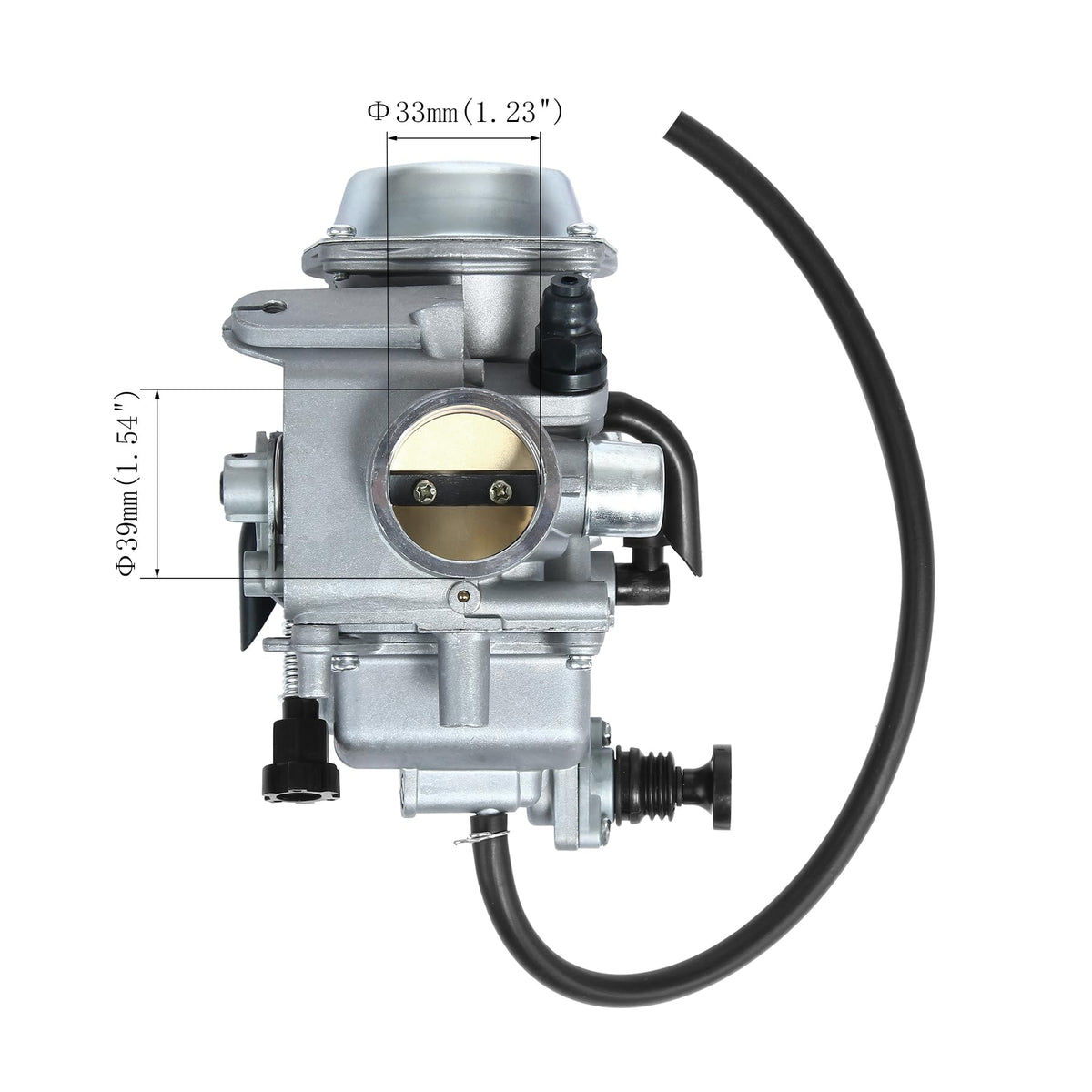 Q: What are the specifications of this Carburetor?A: The Carburetor features an inner diameter of 33mm (intake side) and 50mm (air filter side), with outer diameters of 39mm (intake side) and 54mm (air filter side), ensuring optimal performance for your ATV.