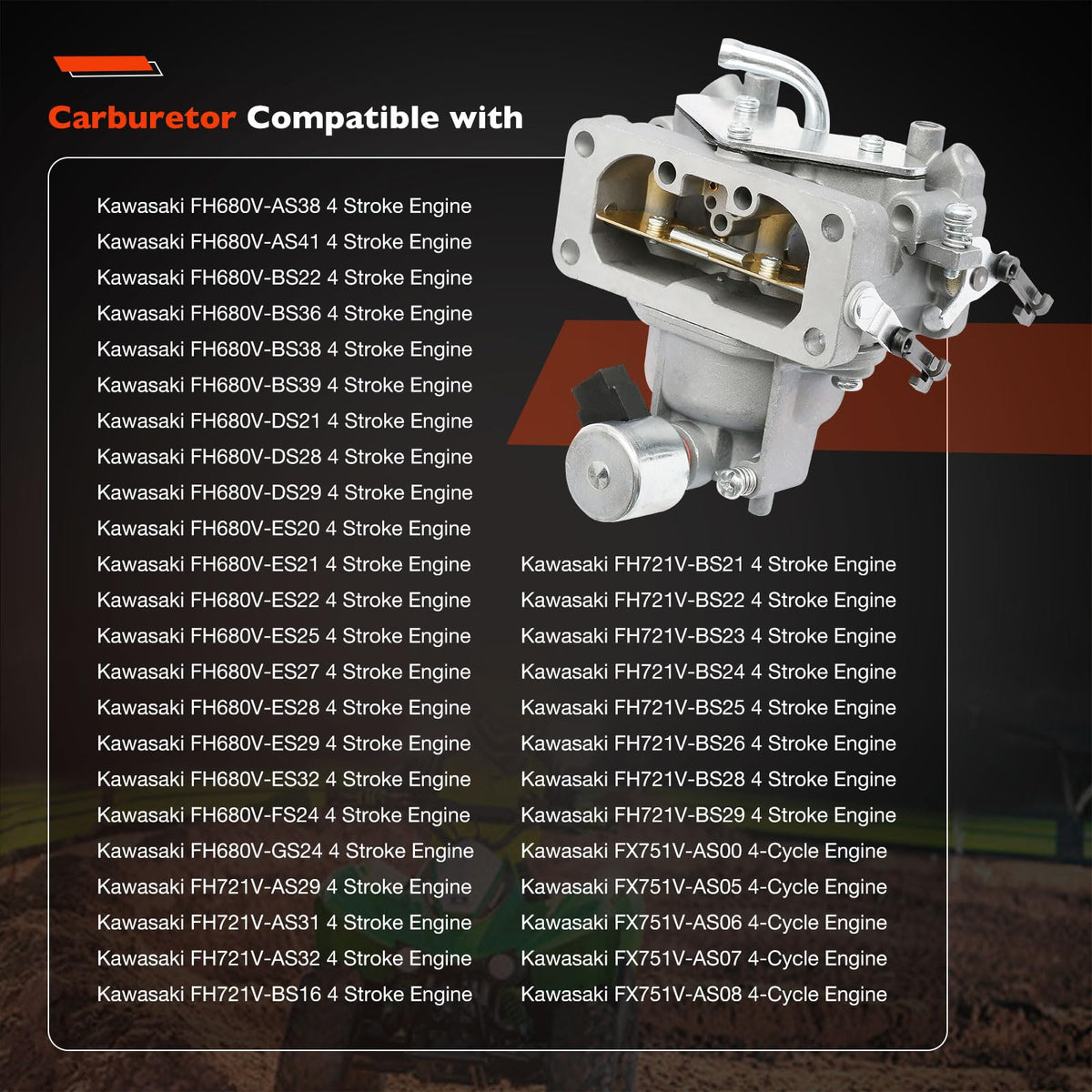 Q: What engines are compatible with the Carburetor for Kawasaki?A: This carburetor is designed to fit Kawasaki 22 HP Engine models including FH641V, FH661V, FH721V, and FX850V. It is a perfect replacement for various models such as FH721V-AS29, FH721V-AS31, and others.