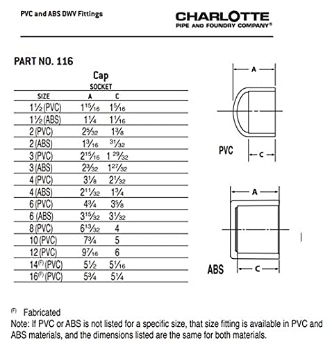 Q: What material is the Charlotte Pipe 3 DWV Cap made from?A: The Charlotte Pipe 3 DWV Cap is made from Acrylonitrile Butadiene Styrene (ABS), a durable plastic that is resistant to impact and suitable for various plumbing applications.