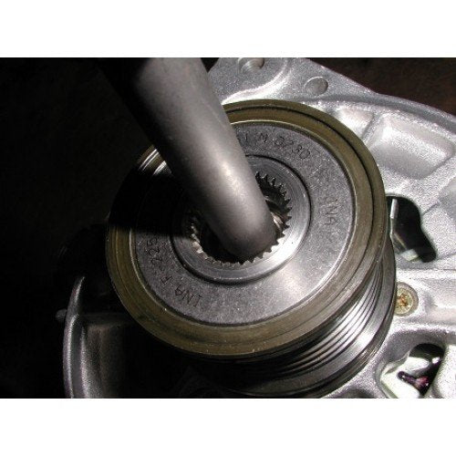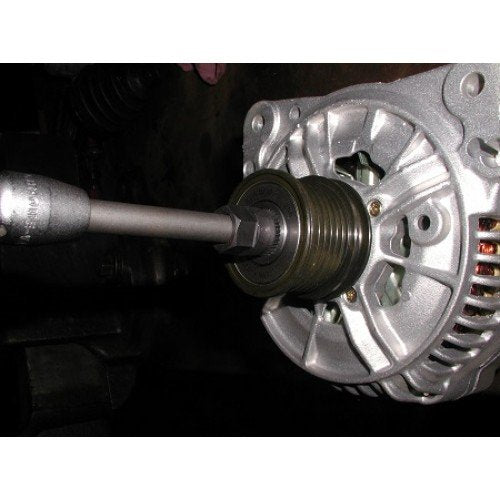 Q: How does the two-part splinted wrench function?A: The two-part splinted wrench is essential for the removal and replacement of free-wheel drive pulleys found on Bosch Alternators. It features a 10-millimeter by 12-millimeter point end that locks the alternator, while the 33-spline cylinder on the shaft inserts into the pulley locking bolt, ensuring a secure fit.