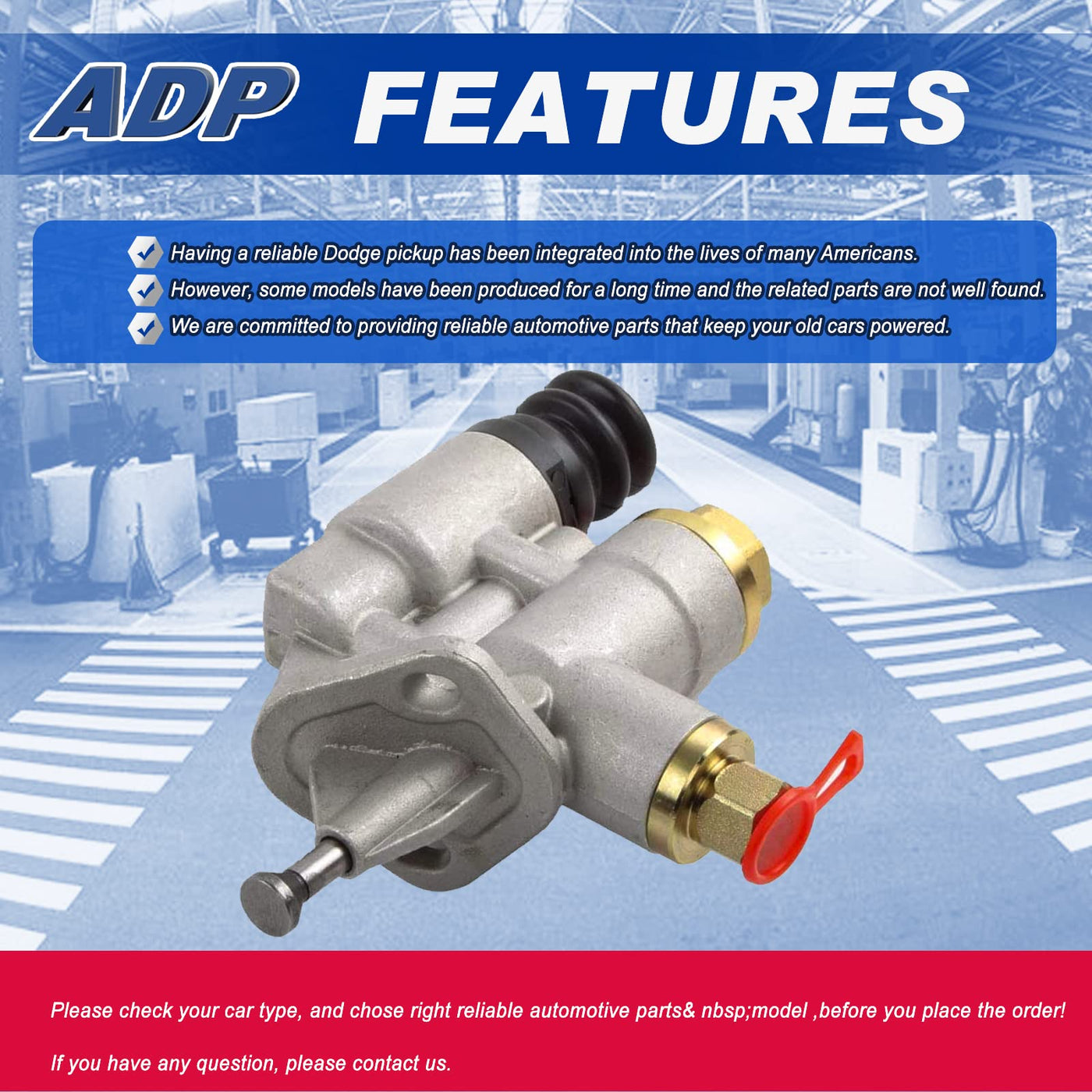 Q: How can I ensure that this fuel pump fits my Dodge pickup?A: To ensure compatibility, please verify your vehicle's make, model, and year against the specified compatibility list. It is crucial to choose the correct automotive parts model before placing your order.