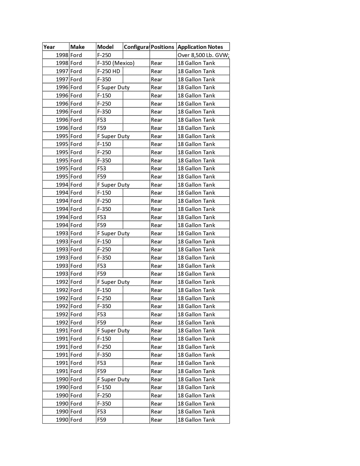 This Replacement Fuel Tank Is Precision-Engineered To Match The Fit And Function Of The Original Fuel Tank On Specified Vehicles. This Part Is Compatible With The Following Vehicles. Before Purchasing, Enter Your Vehicle Trim In The Garage Tool To Confirm Fitment. [Ford F-150: 1990, 1991, 1992, 1993, 1994, 1995, 1996] - [Ford F-250 Hd: 1997] - [Ford F-250: 1990, 1991, 1992, 1993, 1994, 1995, 1996, 1998] - [Ford F-350: 1990, 1991, 1992, 1993, 1994, 1995, 1996, 1997, 1998] - [Ford F-53 Motorhome Chassis: 1990, 1991, 1992, 1993, 1994, 1995, 1996] - [Ford F-59 Commercial Stripped Chassis: 1990, 1991, 1992, 1993, 1994, 1995, 1996] - [Ford F-Super Duty: 1990, 1991, 1992, 1993, 1994, 1995, 1996]