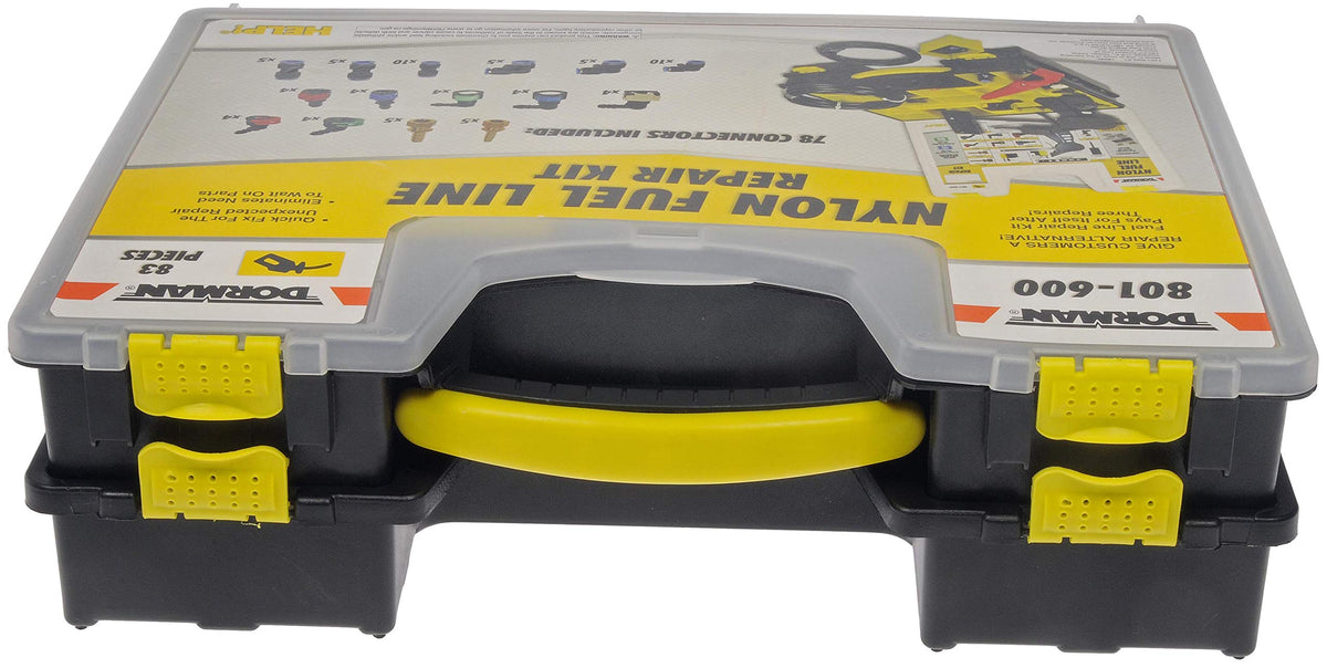 Q: What is included in the Dorman 801-600 Fuel Line Repair Tech Tray?A: The Dorman 801-600 Fuel Line Repair Tech Tray includes 83 connectors and accessories such as single-piece connectors, quick connect nylon unions, and a specialized tool for installing angled connectors.