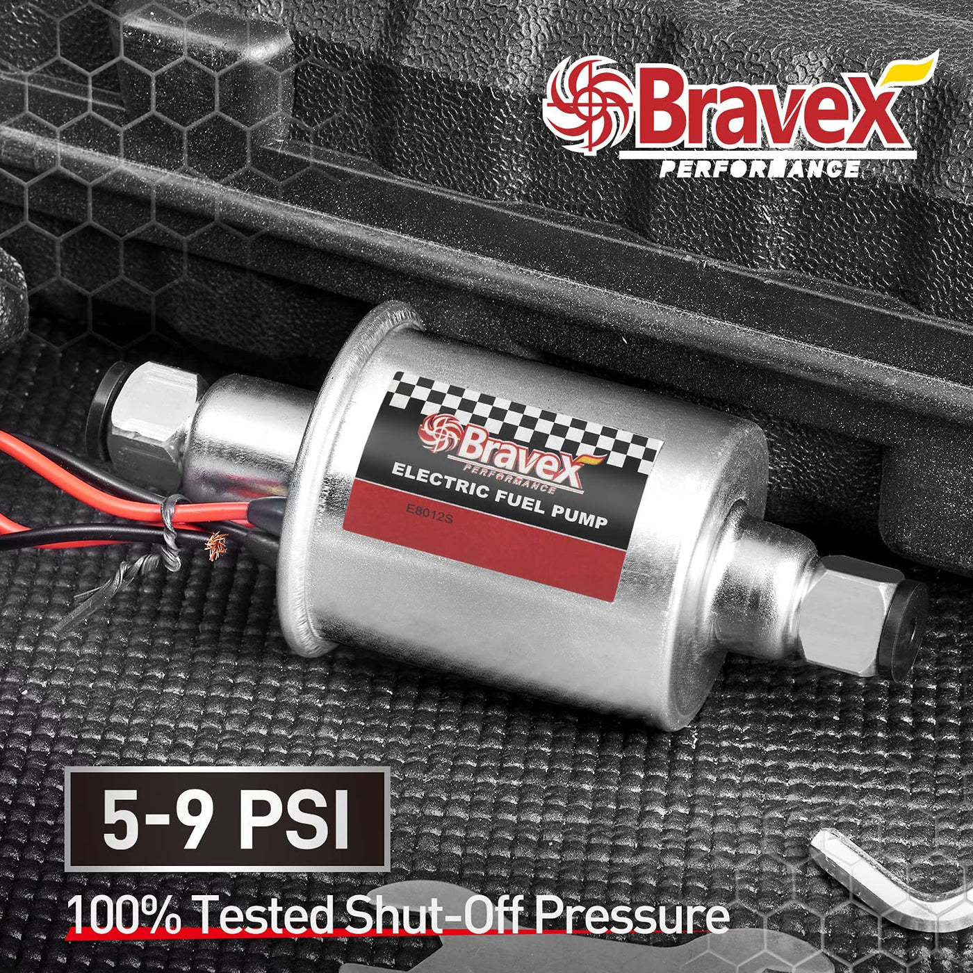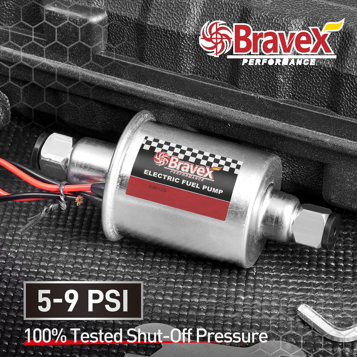Q: What is the flow rate and pressure of the E8012S fuel pump?A: The E8012S Electric Fuel Pump has a flow rate of 30 GPH (gallons per hour) and operates within a pressure range of 5-9 PSI. This makes it suitable for boosting fuel delivery in carbureted vehicles.