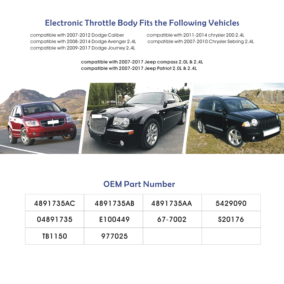 Q: What vehicles are compatible with the Electronic Throttle Body?A: This Electronic Throttle Body is compatible with various models including the Dodge Avenger (2008-2014, 2.4L), Caliber (2007-2012, 1.8L, 2.0L, 2.4L), Journey (2009-2017, 2.4L), Jeep Compass (2007-2017, 2.0L, 2.4L), and Patriot (2007-2017, 2.0L, 2.4L). Please check your specific vehicle model and year to ensure compatibility.