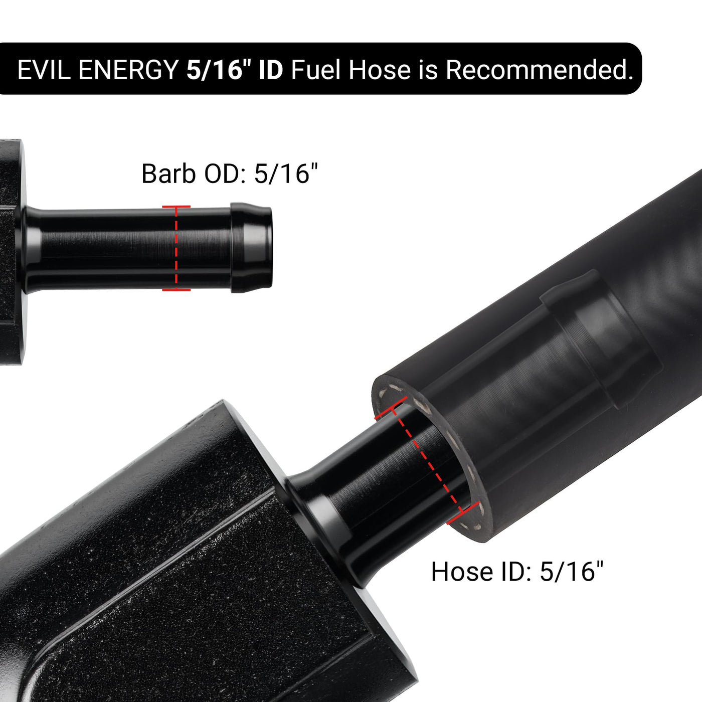 EVIL ENERGY is our brand, we're a direct and professional manufacturer, one of greatest manufacturer and exporter in tuning parts include intake system, exhaust system, fuel system, cooling system, interior and exterior parts. The 10an to 5/16 inch barb is used for pipe link, widely used in fuel system. The barb fitting is made of aluminum alloy 6061-T6 with a black anodized finish. Note: When installing fittings, it is recommended to use clamps to ensure sealing.
