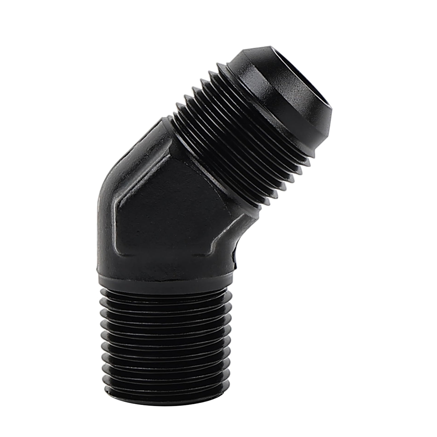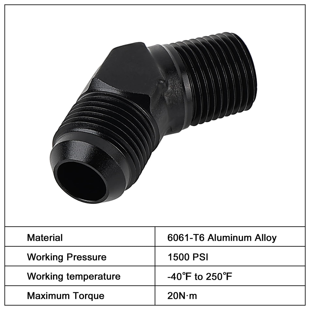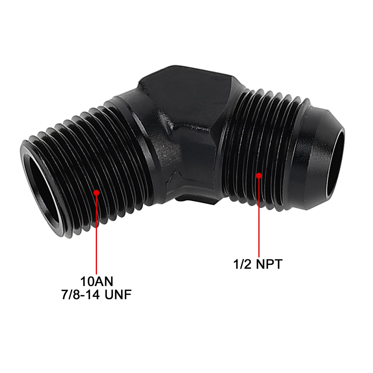 [Size] 1/2'' NPT to AN10, the thread size of 10AN is 7/8-14 UNF , Degree: 45 degree elbow. | [Material] Made of aluminum alloy 6061-T6, anodized black surface. | [Sealing] The AN side of the flare is sealed by a 37 degree angle and the NPT thread side is sealed by a 60 degree tapered thread. | [Application] Widely used in fuel system, cooling system, power steering system, etc. | [Notice] To ensure no leakage at the NPT end, sealant or PTFE tape is strongly recommended. Easy installation and removal with wrench.
