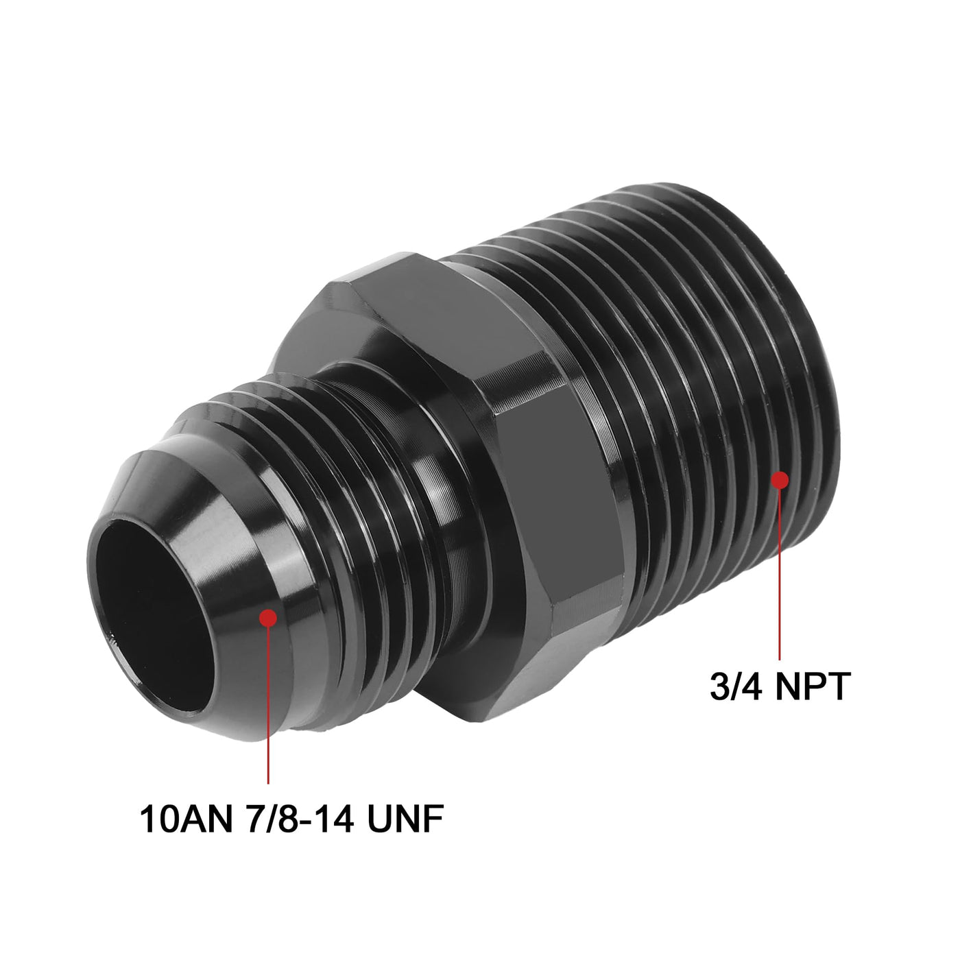 [Size] AN10 to 3/4'' pipe, the thread size of 10AN is 7/8-14 UNF. | [Material] Made of aluminum alloy 6061-T6, anodized black surface, bright appearance, anti-corrosion. | [Sealing] The AN side of the flare is sealed by a 37 degree angle and the NPT thread side is sealed by a 60 degree tapered thread. | [Application] Widely used in fuel system, cooling system, power steering system, etc. | [Notice] To ensure no leakage at the NPT end, sealant or PTFE tape is strongly recommended. Easy installation and removal with wrench.