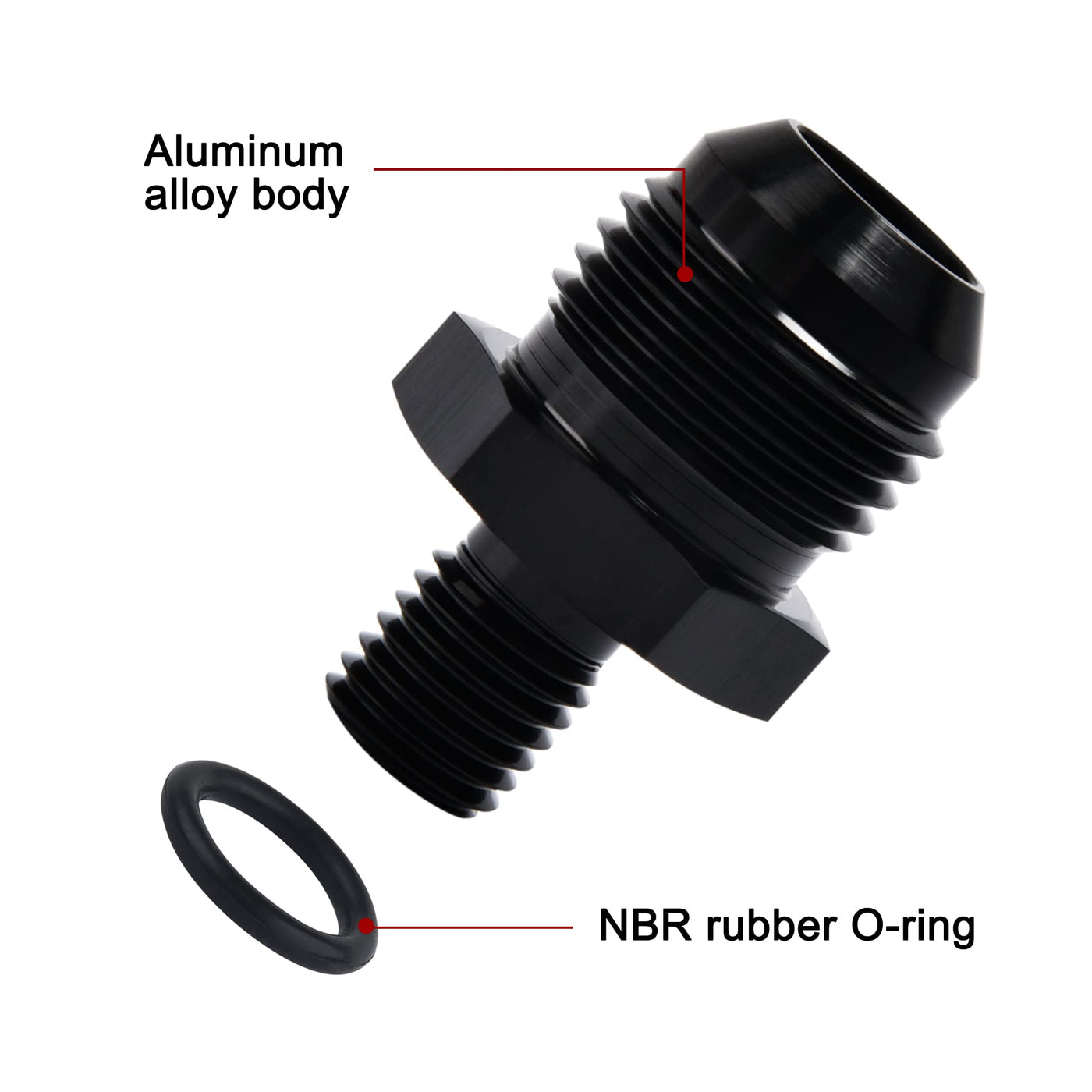 Q: What materials are used in the construction of this fitting adapter?A: This fitting adapter is made of high-quality aluminum alloy 6061-T6 for the body and features an NBR rubber o-ring for sealing.