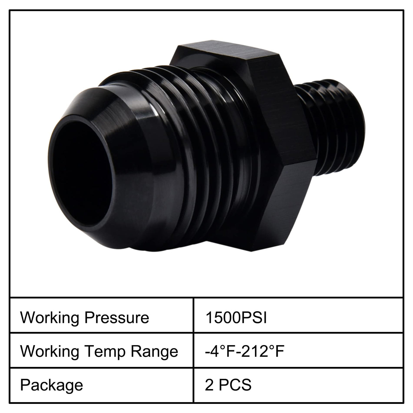 Q: What is the maximum working pressure and temperature for this adapter?A: The EVIL ENERGY fitting adapter can handle a maximum working pressure of 1500PSI and a temperature range of -4°F to 212°F (-20° to 100° Celsius).