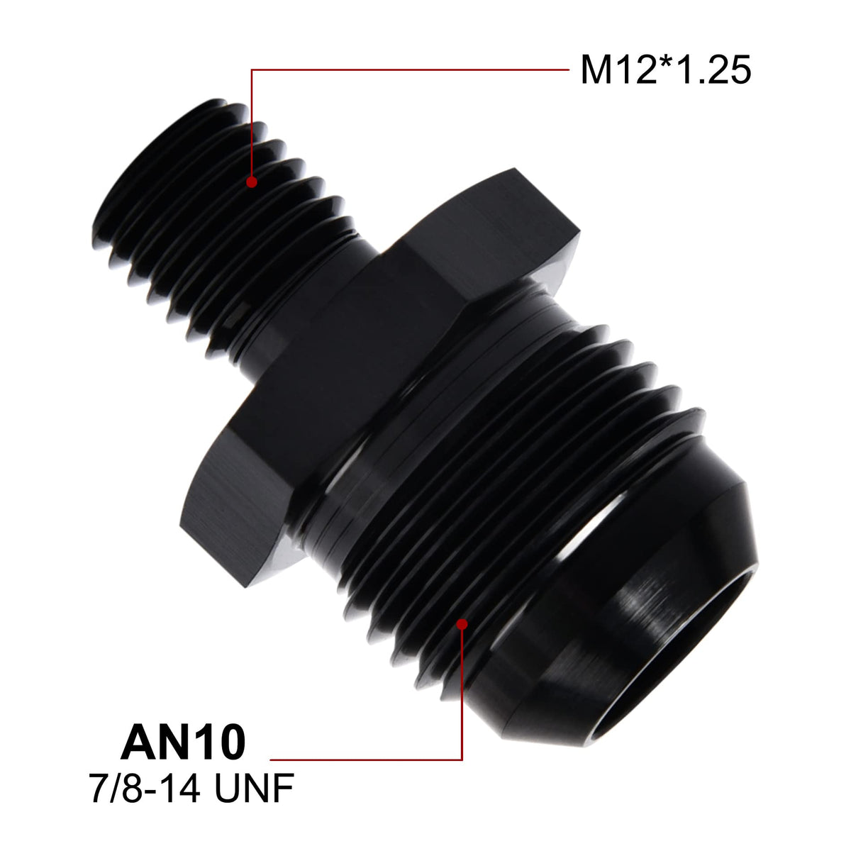 Q: What is the thread size of the EVIL ENERGY 10AN Male Flare to M12 x 1.25mm fitting?A: The thread size of the EVIL ENERGY fitting is 10AN, which corresponds to 7/8-14 UNF, and the metric side is M12 x 1.25mm.