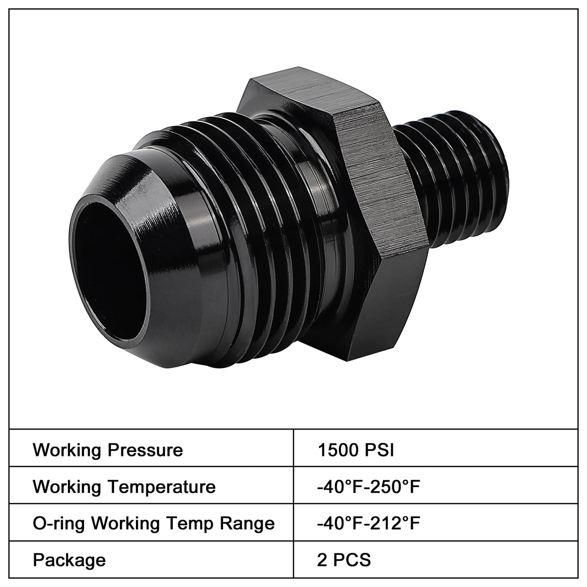 Size: The thread size of 10AN is 7/8-14 UNF and that of metric side is M12 x 1.5mm. | Sealing: The AN side of the flare is sealed by a 37 degree angle and the metric thread side is sealed by an o-ring. | Parameter: Working pressure: 1500PSI; Working temperature: -4