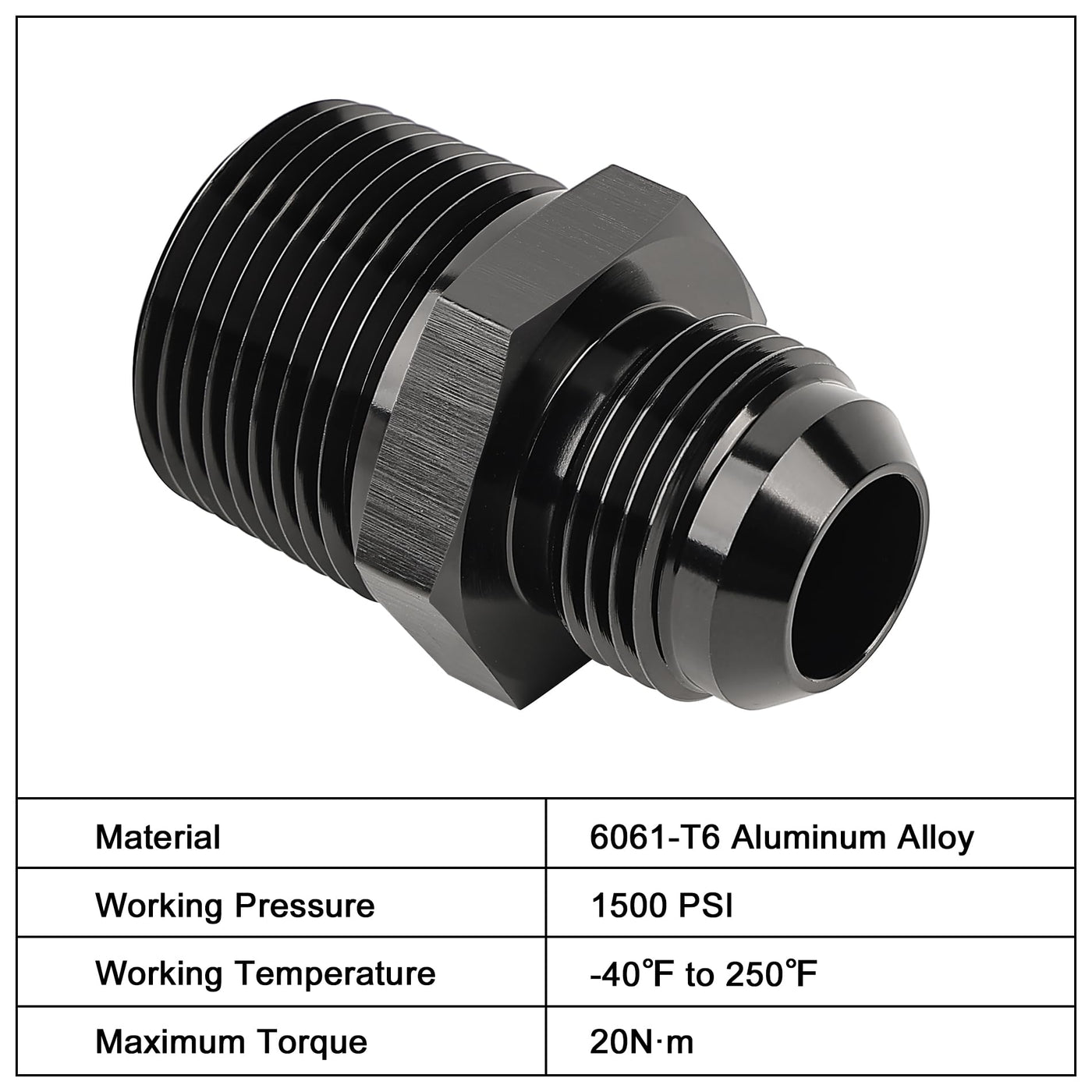 [Size] 1 NPT to AN12 , the thread size of 12AN is 1-1/16-12 UNF. | [Material] Made of aluminum alloy 6061-T6, anodized black surface, bright appearance, anti-corrosion. | [Sealing] The AN side of the flare is sealed by a 37 degree angle and the NPT thread side is sealed by a 60 degree tapered thread. | [Application] Widely used in fuel system, cooling system, power steering system, etc. | [Notice] To ensure no leakage at the NPT end, sealant or PTFE tape is strongly recommended. Easy installation and removal with wrench.