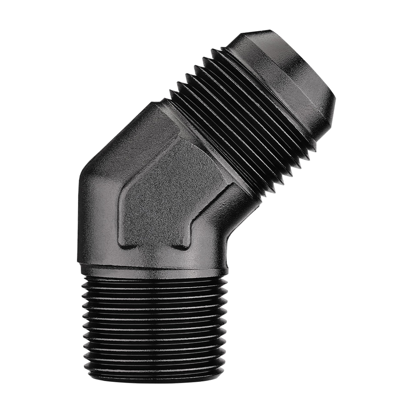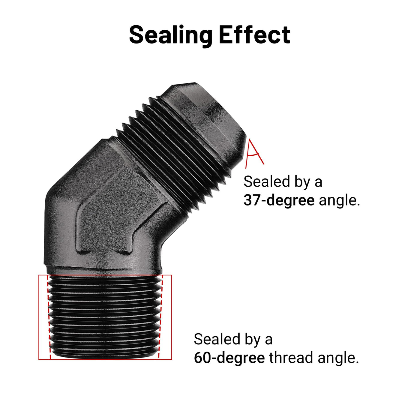 Size:3/4'' NPT to AN12, the thread size of 12AN is 1-1/16-12 UNF , Degree: 45 degree elbow | Material: Made of aluminum alloy 6061-T6, anodized black surface | Sealing: The AN side of the flare is sealed by a 37 degree angle and the NPT thread side is sealed by a 60 degree tapered thread | Application: Widely used in fuel system, cooling system, power steering system, etc | Notice: To ensure no leakage at the NPT end, sealant or PTFE tape is strongly recommended. Recommended to use a wrench for installation and removal, 5-10 seconds to complete installation