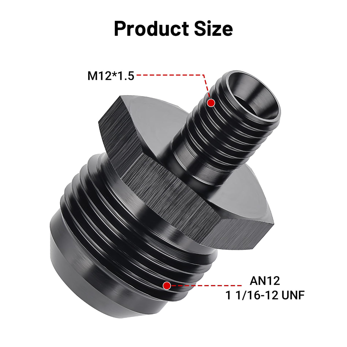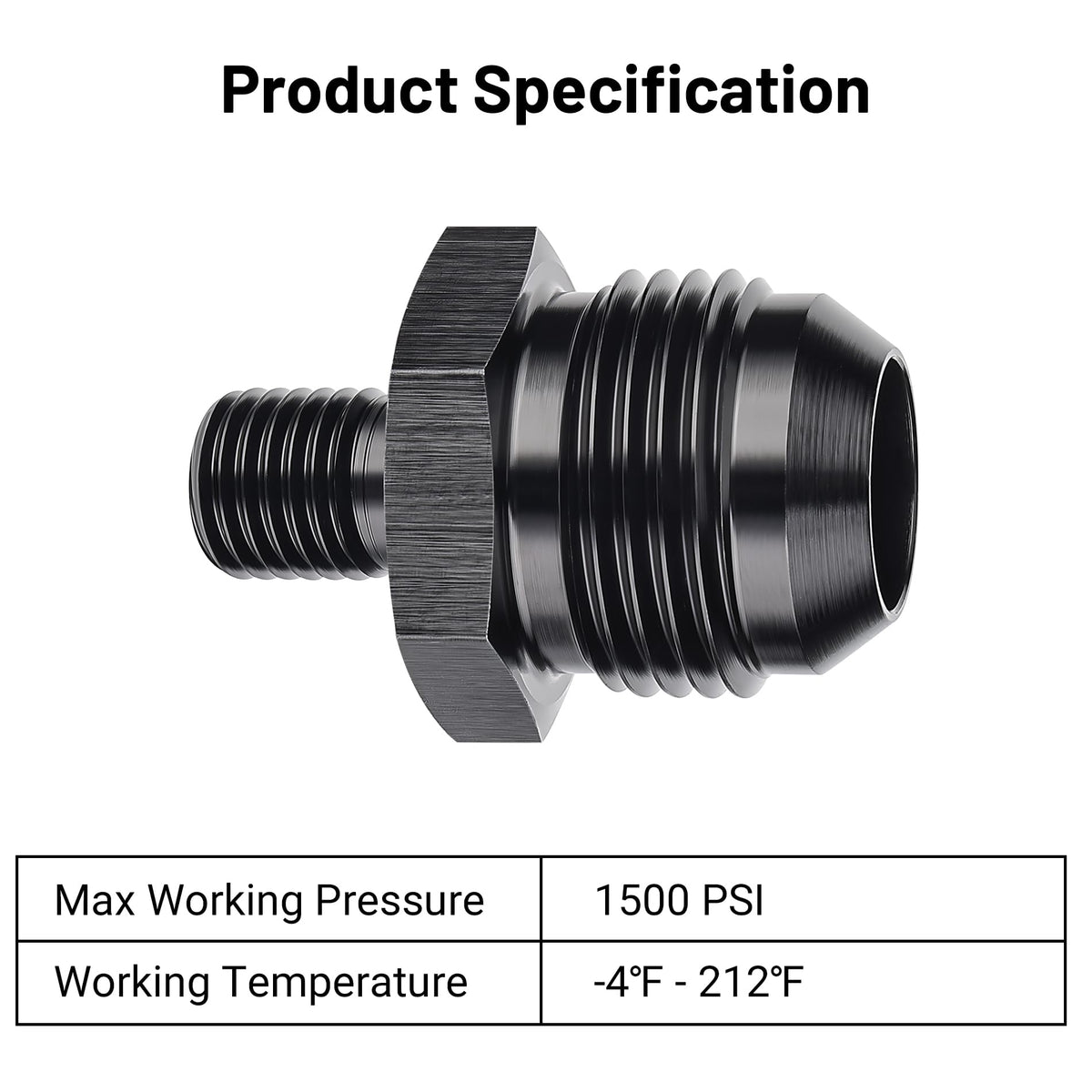Size: The thread size of 12AN is 11/16-12 UNF and that of metric side is M12 x 1.5mm. | Sealing: The AN side of the flare is sealed by a 37 degree angle and the metric thread side is sealed by an o-ring. | Parameter: Working pressure: 1500PSI; Working temperature: -4