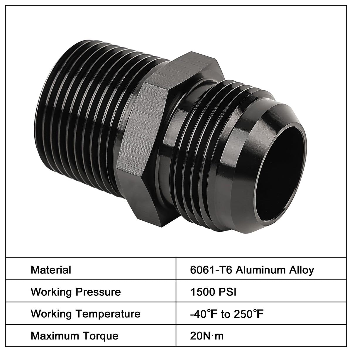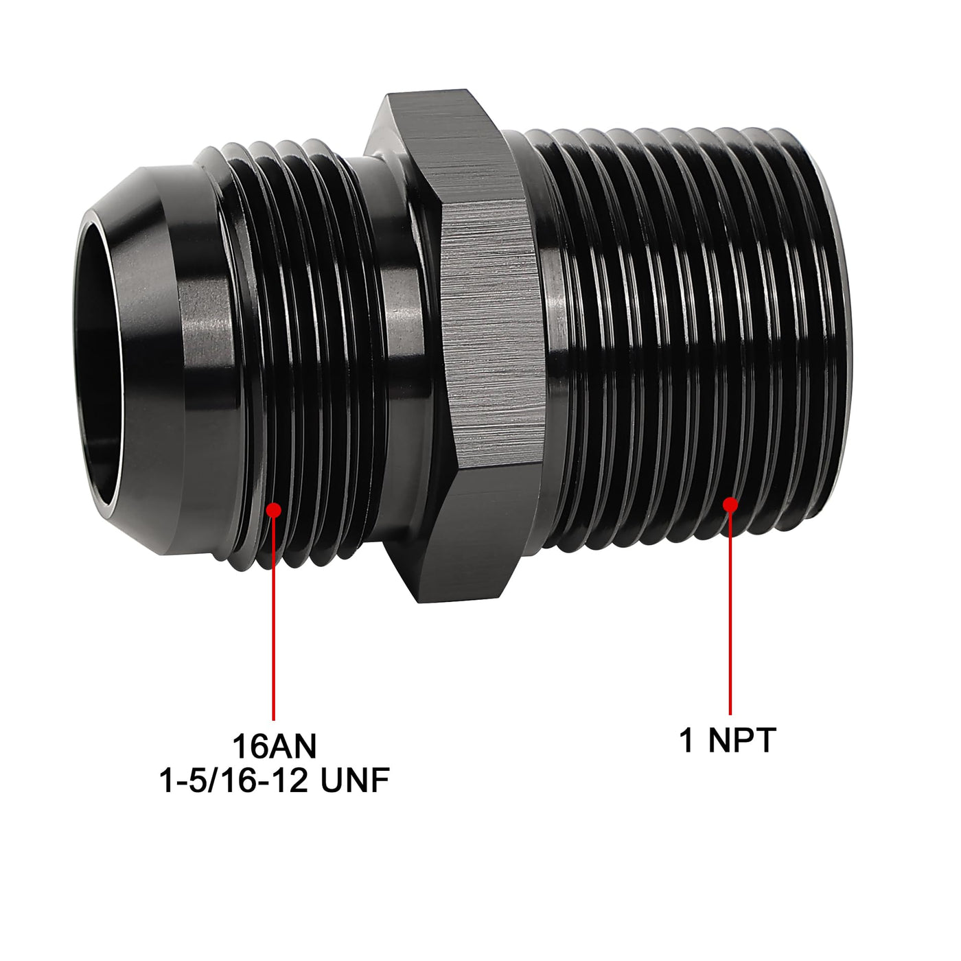 [Size] 1 NPT to AN16 , the thread size of 16AN is 1-5/16-12 UNF. | [Material] Made of aluminum alloy 6061-T6, anodized black surface, bright appearance, anti-corrosion. | [Sealing] The AN side of the flare is sealed by a 37 degree angle and the NPT thread side is sealed by a 60 degree tapered thread. | [Application] Widely used in fuel system, cooling system, power steering system, etc. | [Notice] To ensure no leakage at the NPT end, sealant or PTFE tape is strongly recommended. Easy installation and removal with wrench.