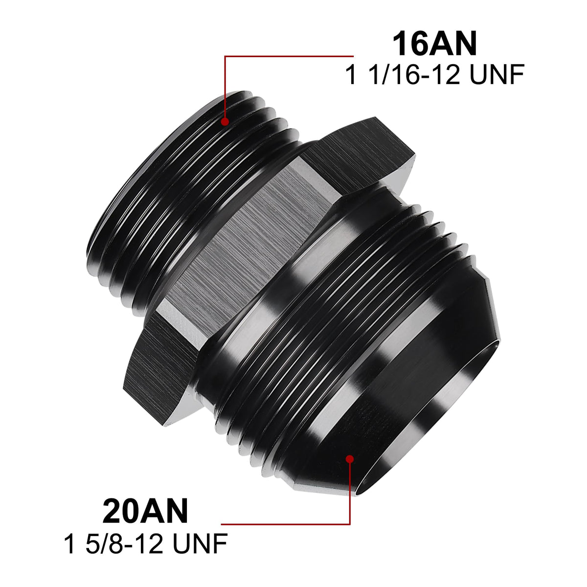 Q: What are the thread sizes for the EVIL ENERGY 20AN Flare to AN16 ORB Male O-Ring Fitting Adapter?A: The thread size of the 20AN fitting is 15/8-12 UNF, while the thread size of the AN16 ORB fitting is 15/16-12 UNF.