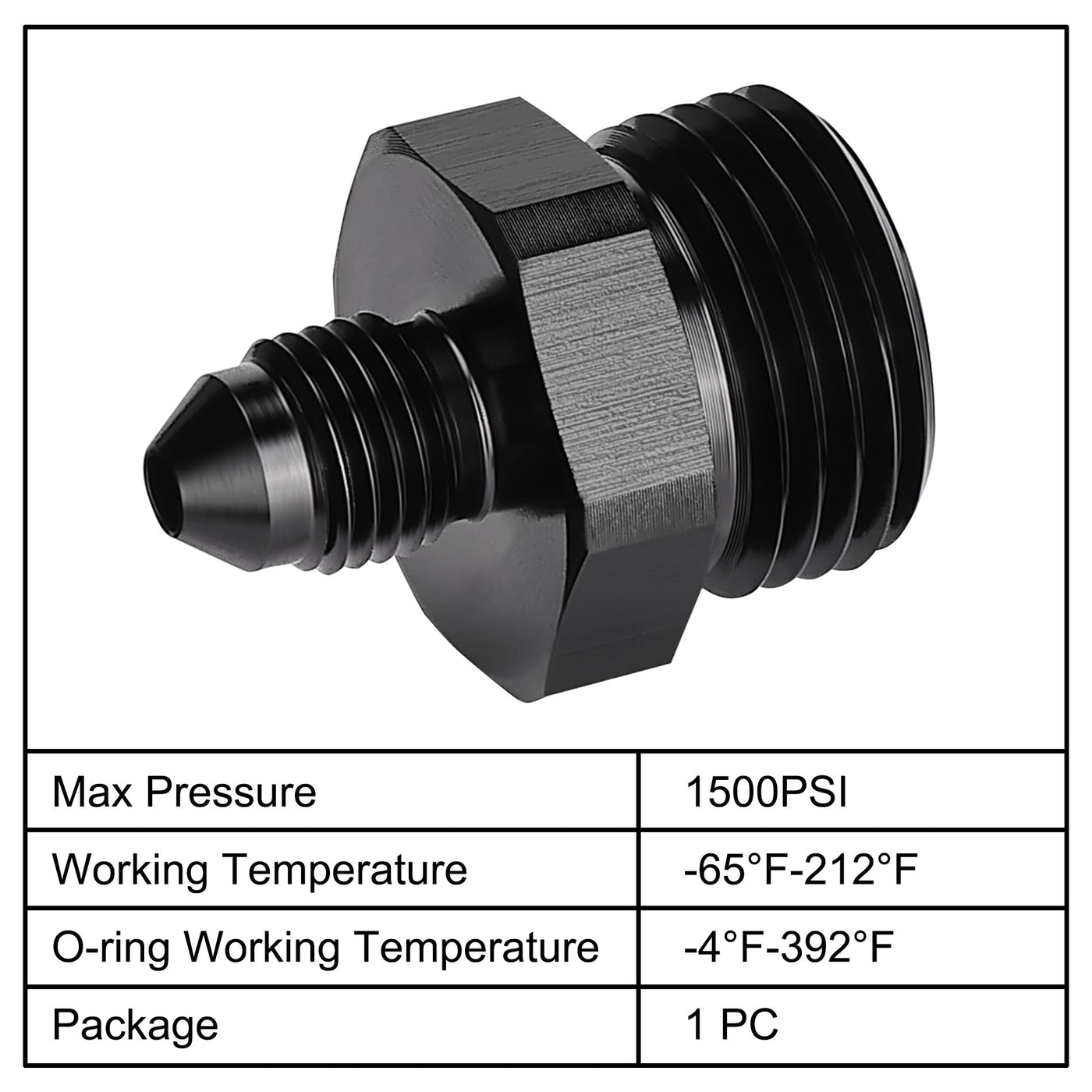 Q: What is the maximum working pressure and temperature for this fitting?A: The maximum working pressure for this fitting adapter is 1500 PSI, with a working temperature range of -65°F to 252°F, and the O-ring temperature range from -4°F to 392°F.