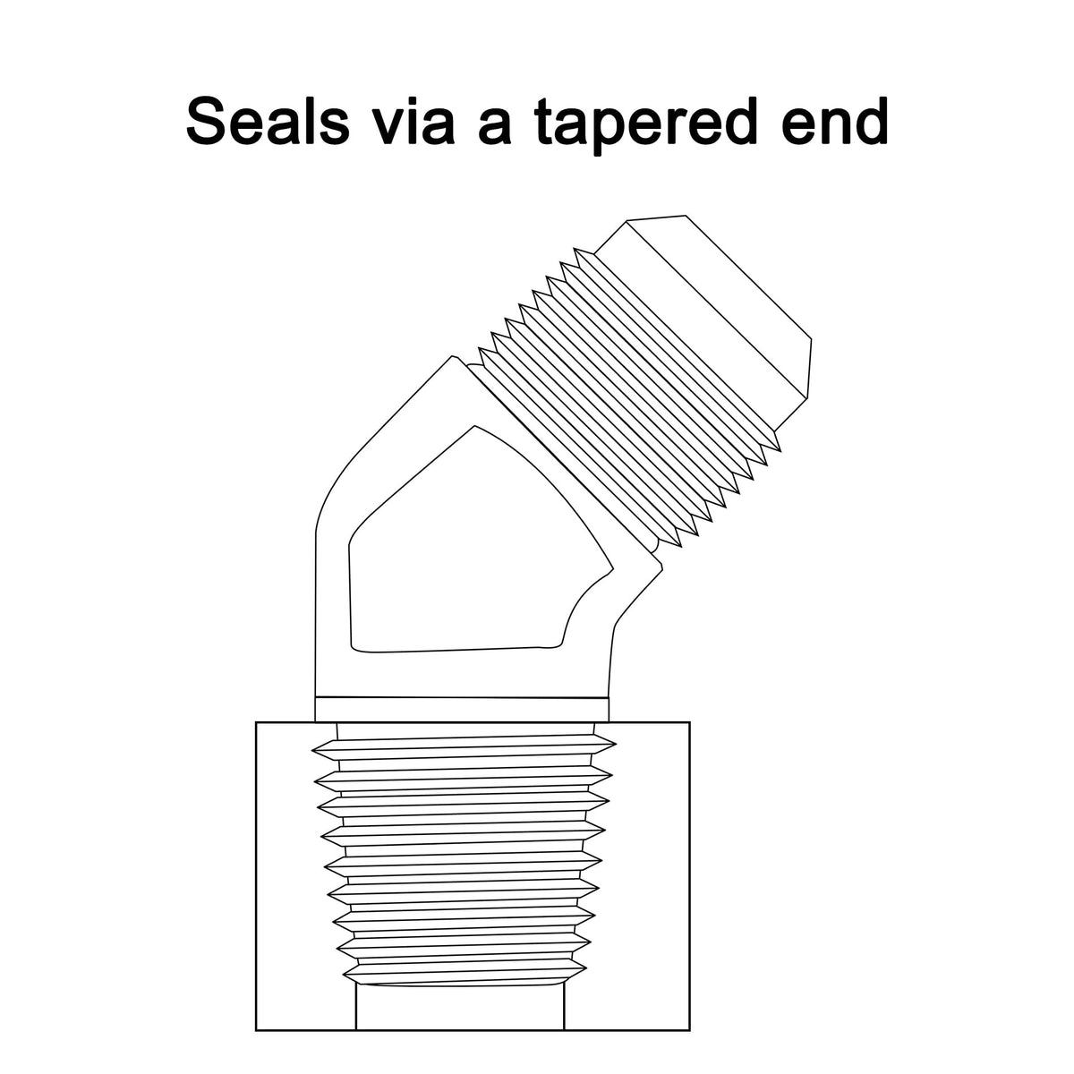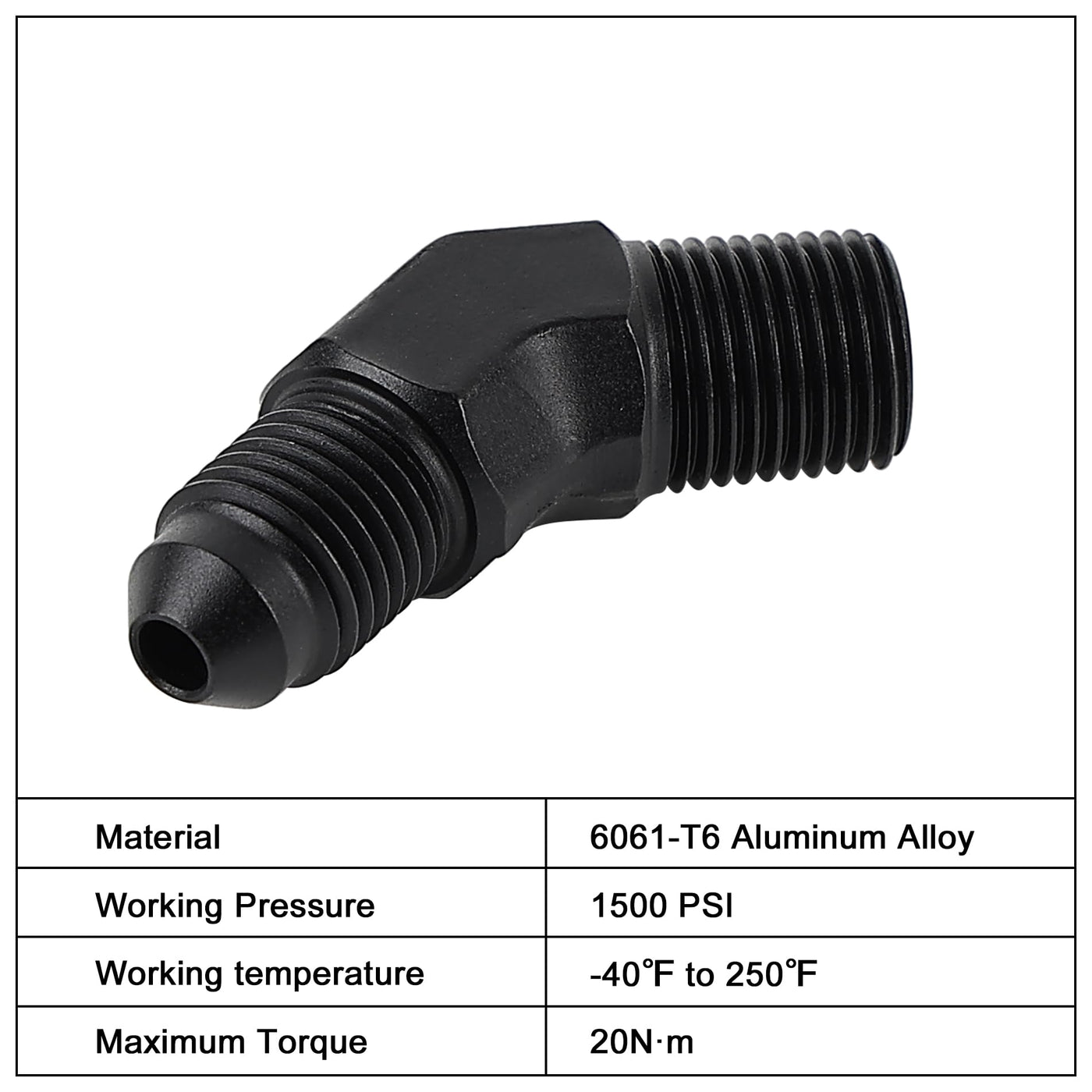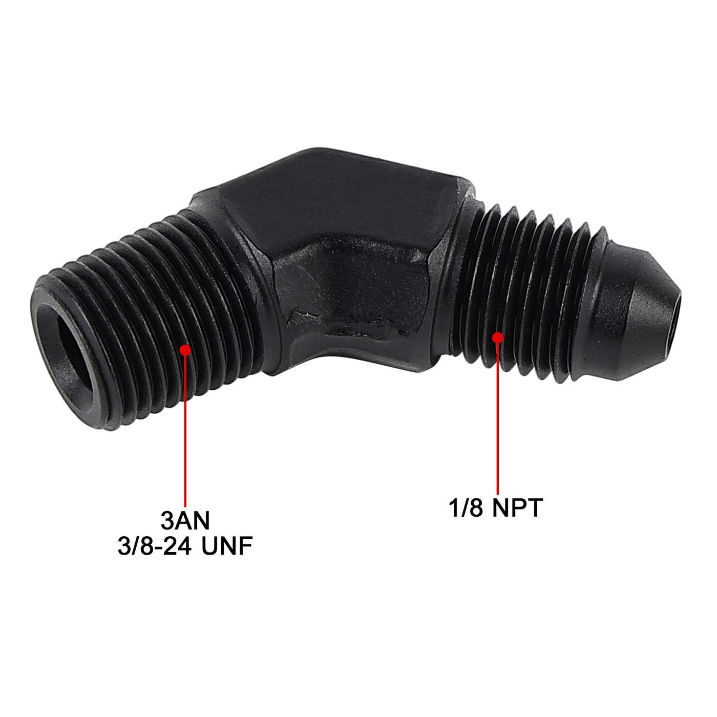 [Size] 1/8'' NPT to AN3, the thread size of 3AN is 3/8-24 UNF, Degree: 45 degree elbow. | [Material] Made of aluminum alloy 6061-T6, anodized black surface. | [Sealing] The AN side of the flare is sealed by a 37 degree angle and the NPT thread side is sealed by a 60 degree tapered thread. | [Application] Widely used in fuel system, cooling system, power steering system, etc. | [Notice] To ensure no leakage at the NPT end, sealant or PTFE tape is strongly recommended. Easy installation and removal with wrench.
